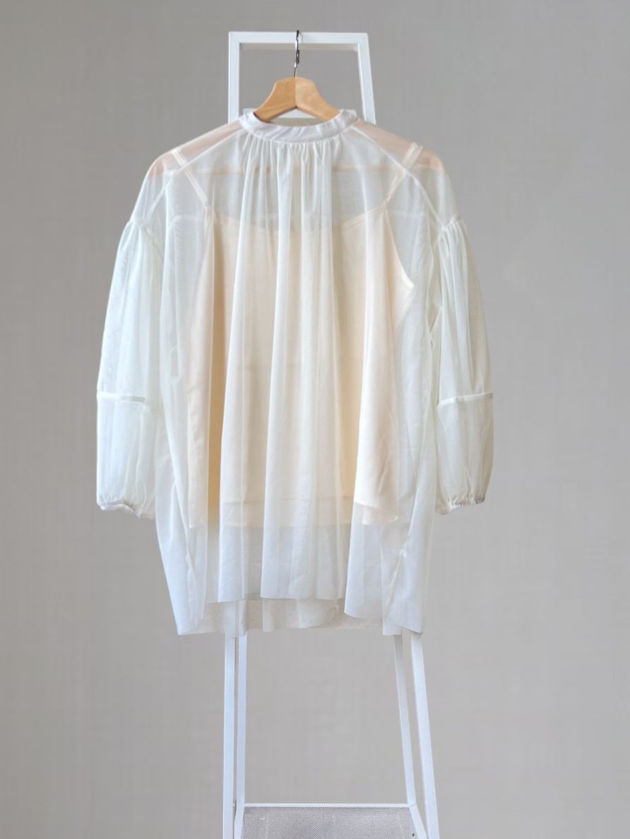 スタンドカラーから流れるドレープと、袖の切り返しがより一層エアリー感を与え動くたびに揺れる質感が女性らしさを引き立ててくれるアイテムです。