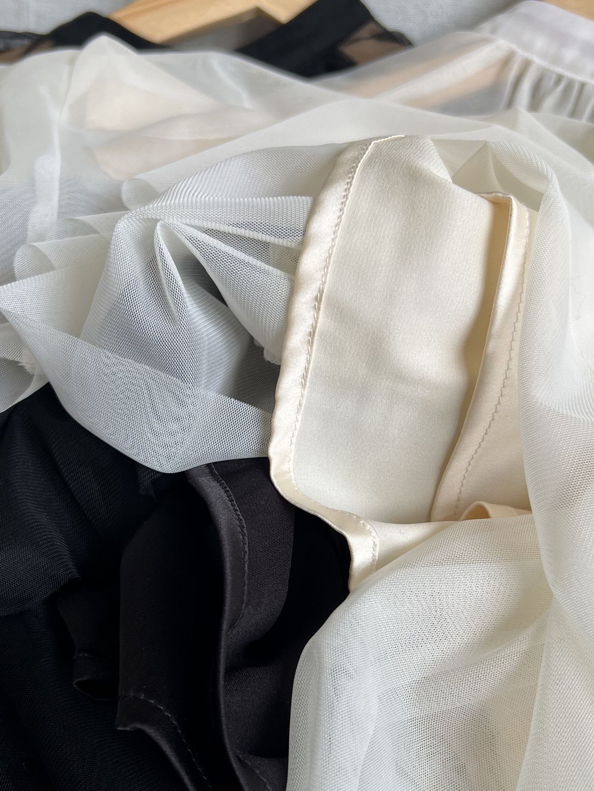 光沢のあるサテン生地のインナーも付いているので1枚で着用するのはもちろん、ベストやビスチェなどのレイヤードスタイルにもぴったりです。
