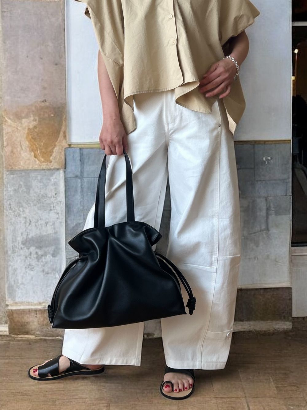 絞ればコンパクトで女性らしく、広げればトートバッグのような表情に変化し、小型PCやiPadも収納可能な実用性も兼ね備えています。