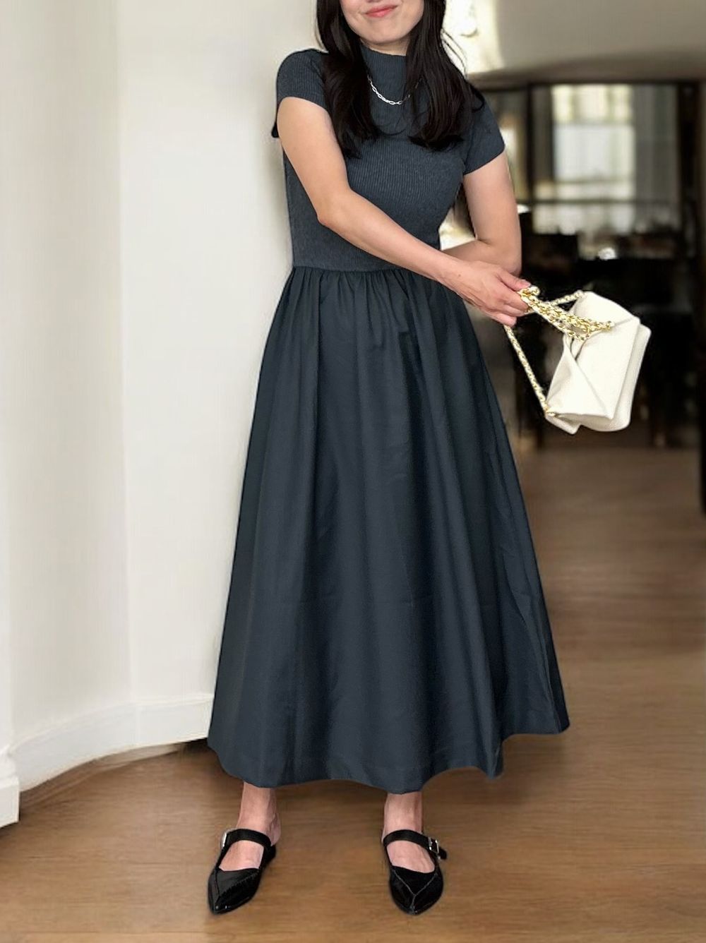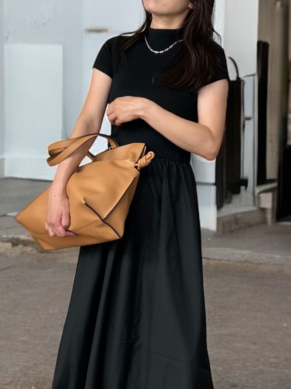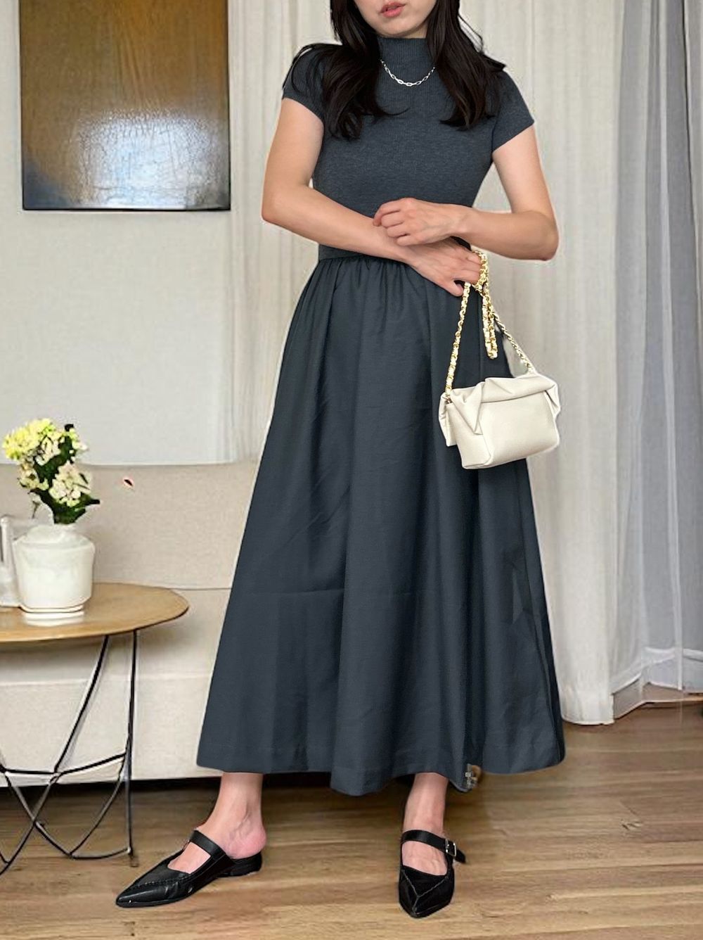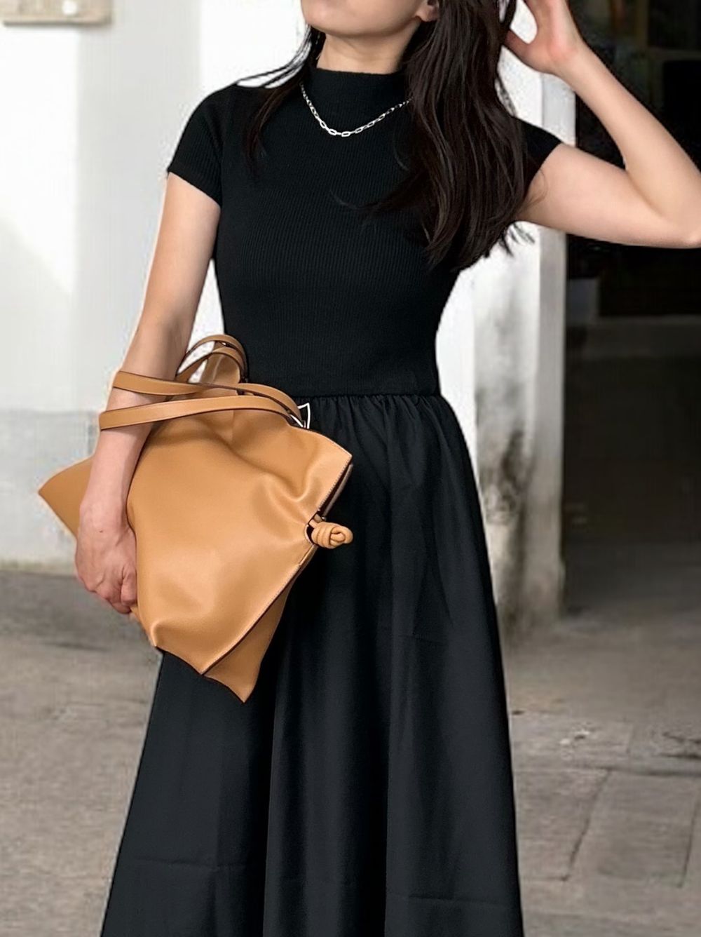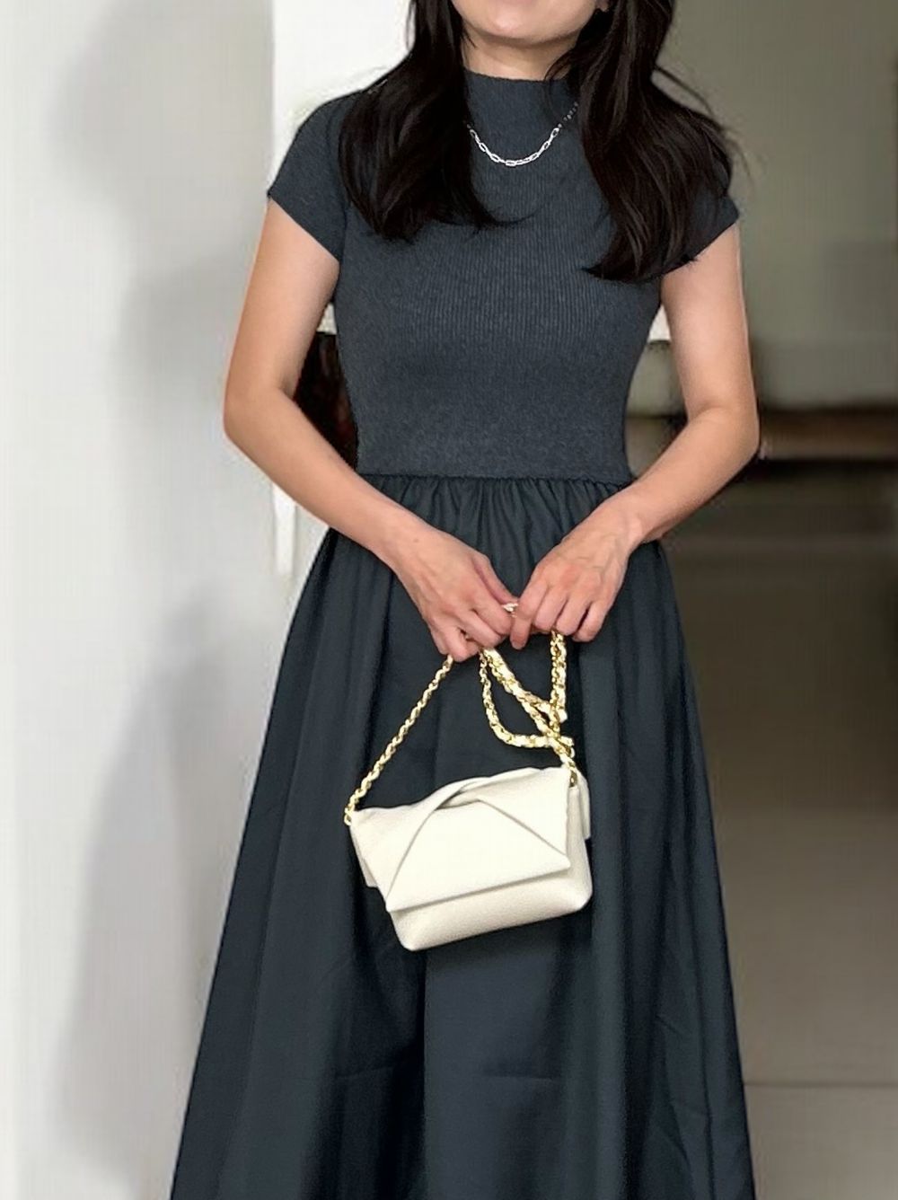 異素材感が生む美しいコントラストが魅力の大人の品格漂うデザインで、アクセサリーやバッグなどの小物使いで昼夜で異なる雰囲気を演出できます。