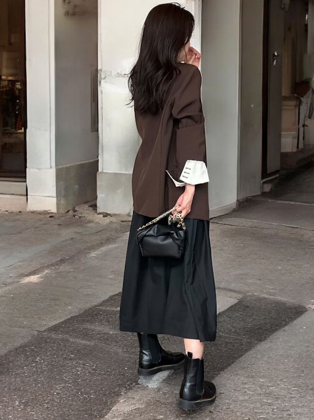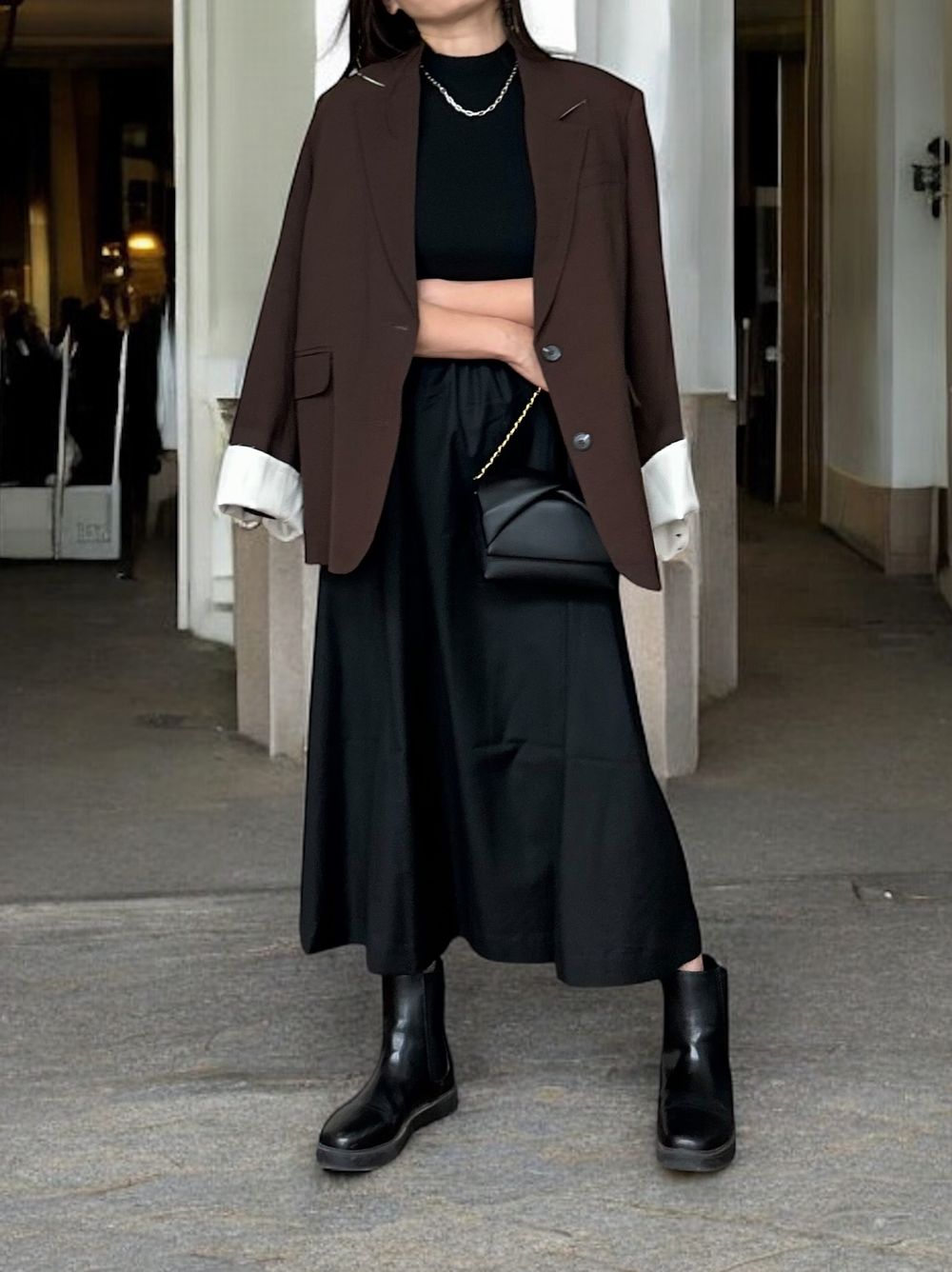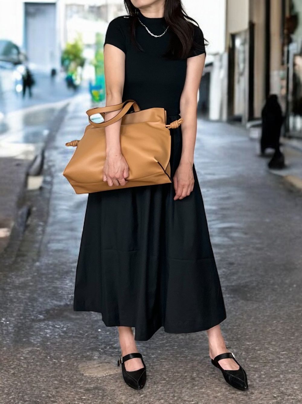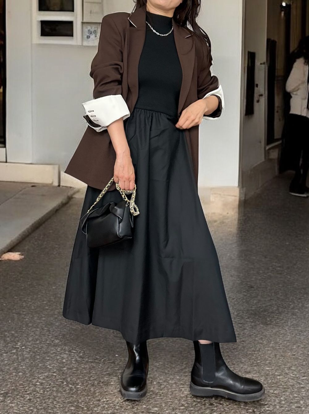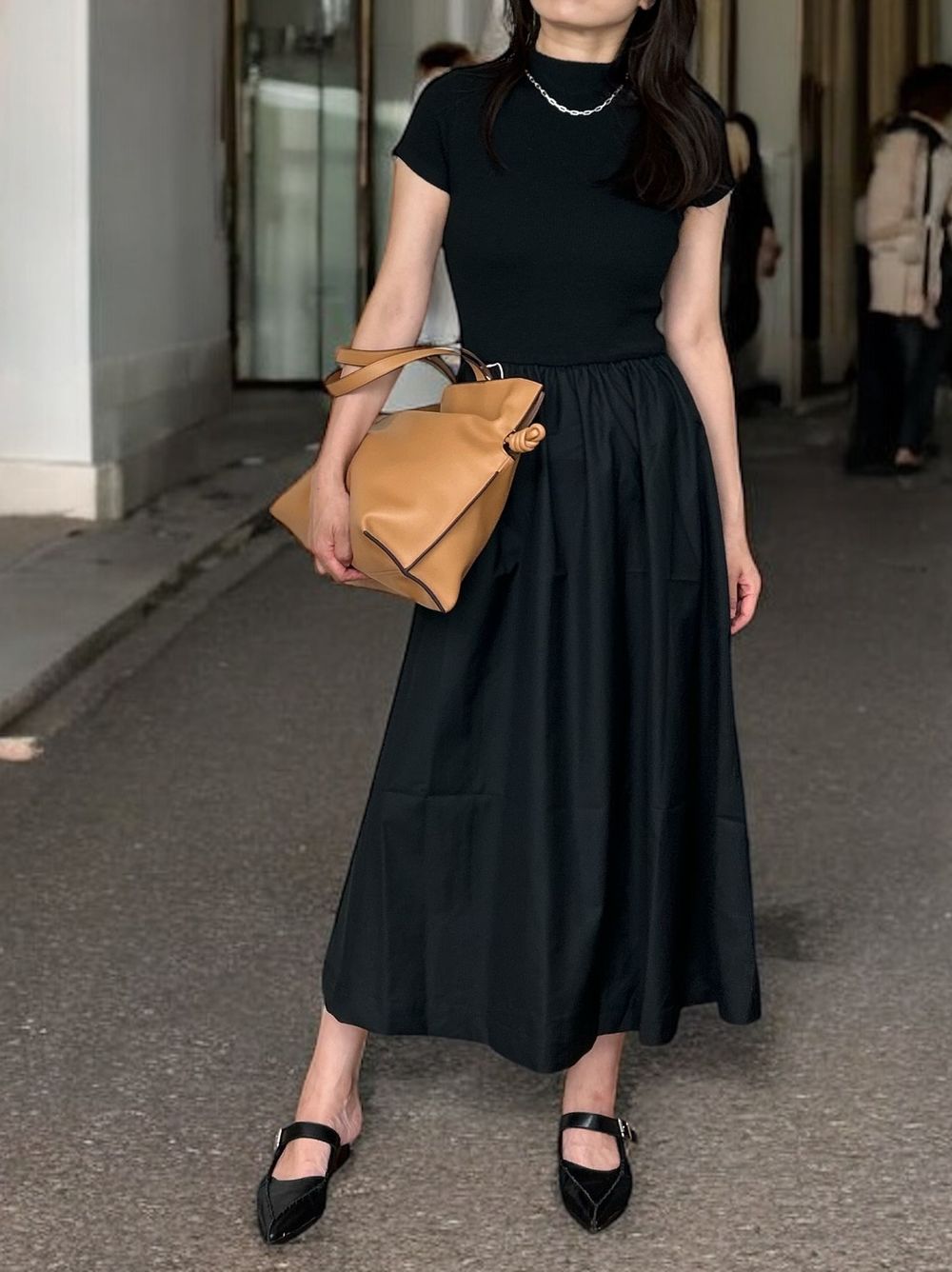 異素材感が生む美しいコントラストが魅力の大人の品格漂うデザインで、アクセサリーやバッグなどの小物使いで昼夜で異なる雰囲気を演出できます。