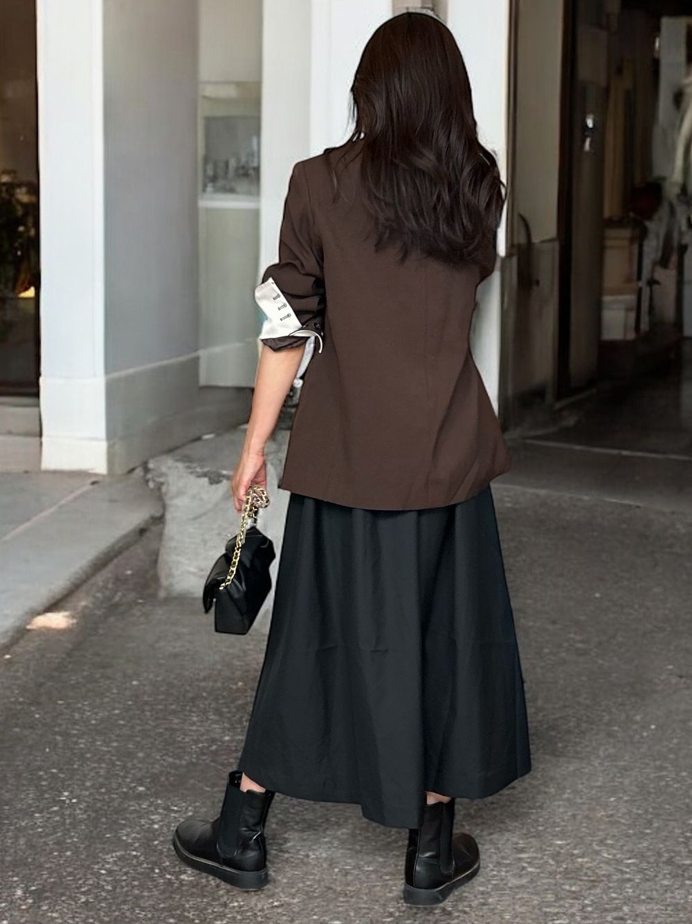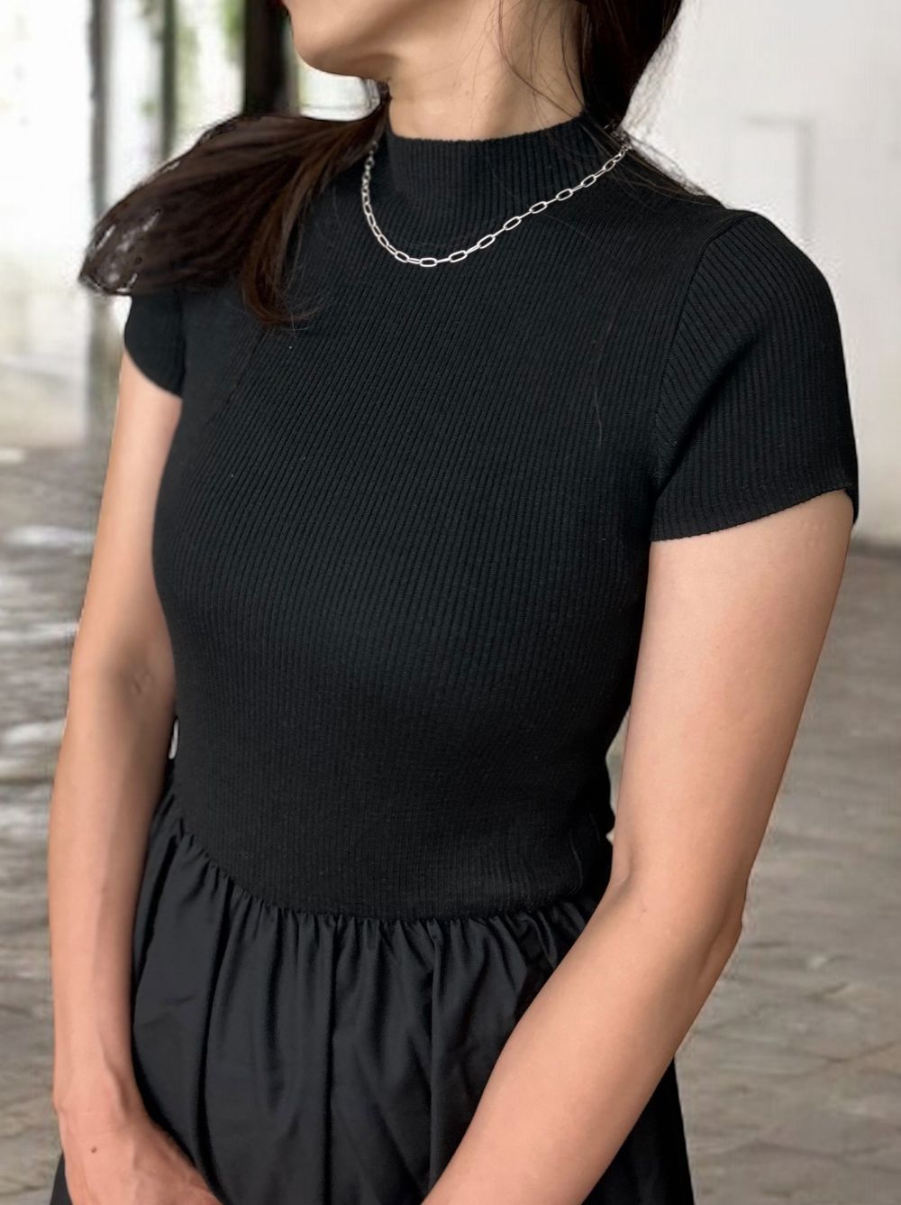首回りをすっきり見せてくれるハイネックに、後ろのボタン留め部分からチラっと見えるお肌によって、より一層女性らしい雰囲気に仕上げてくれます。