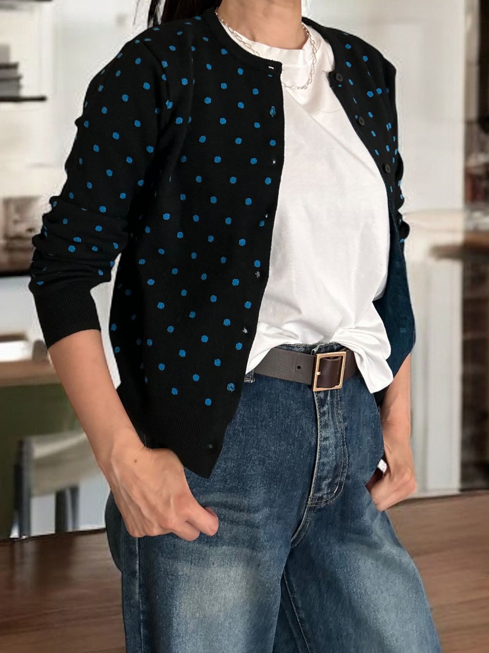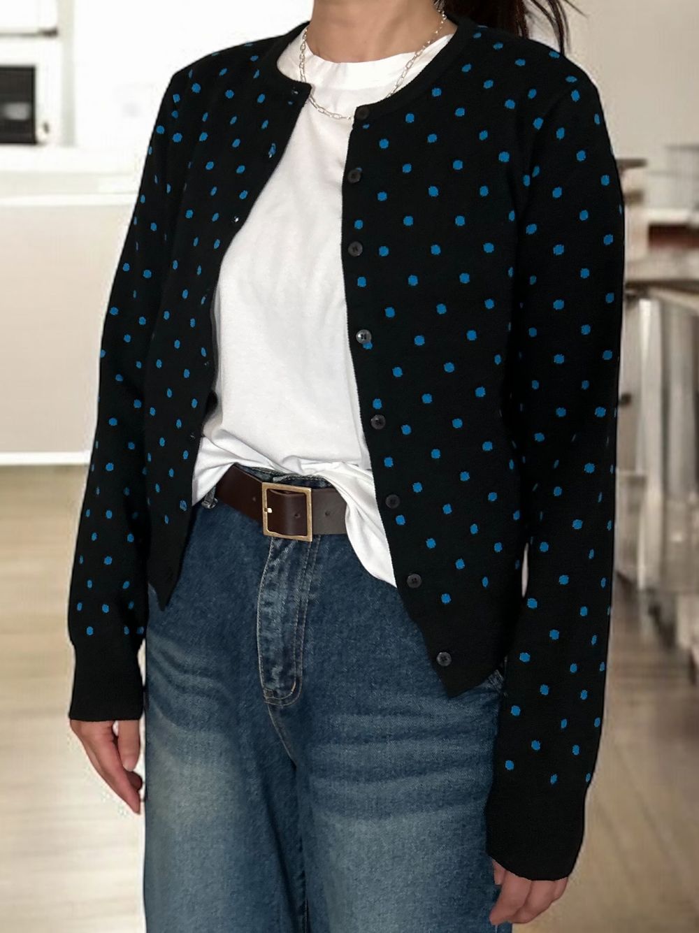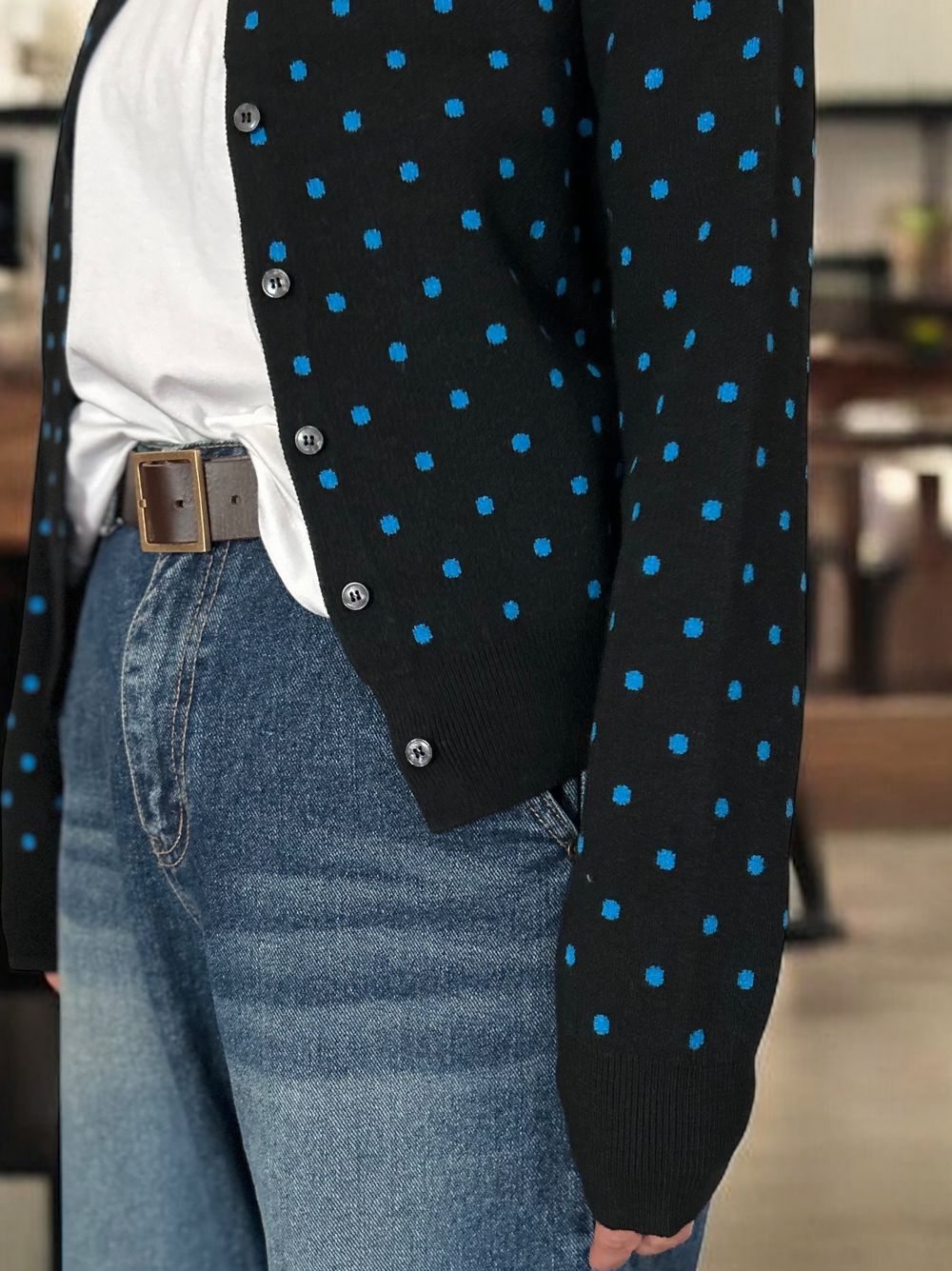 ベーシックな定番カラーに主張しすぎない小さめのドット柄を施したカシミアブレンドのクルーネックカーディガン。