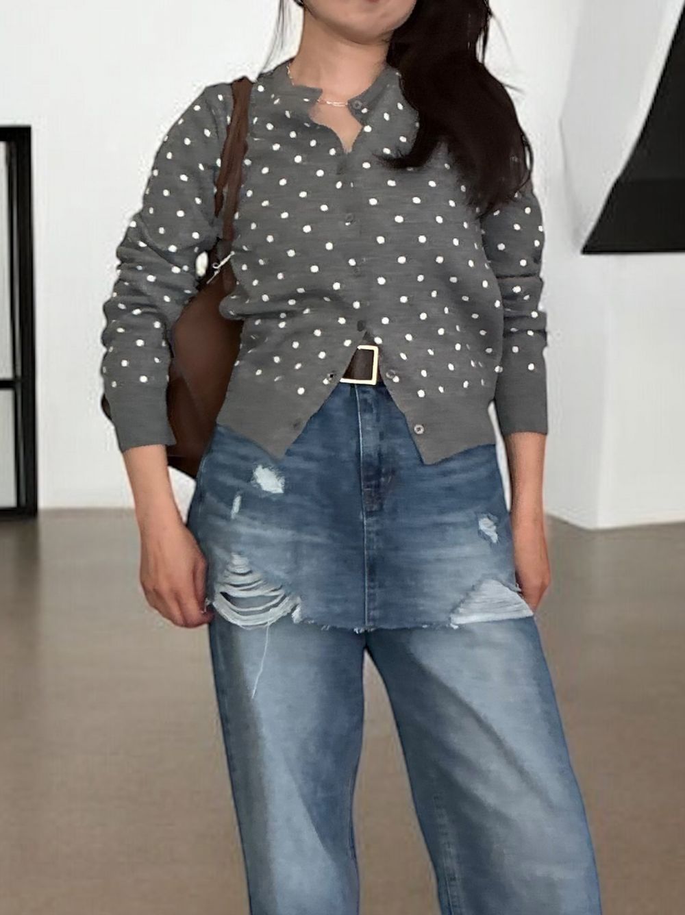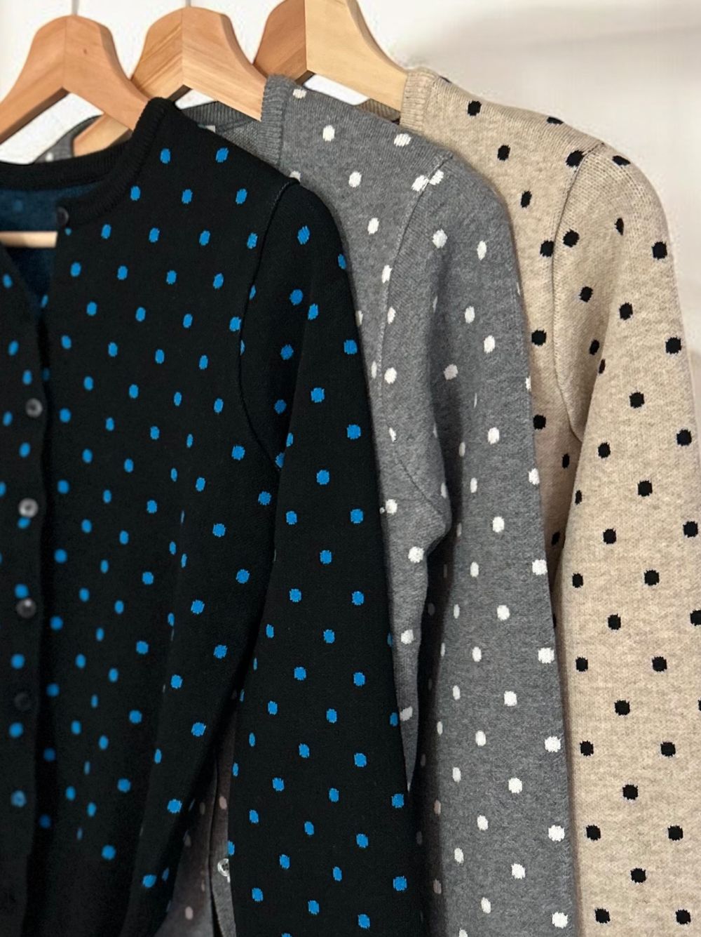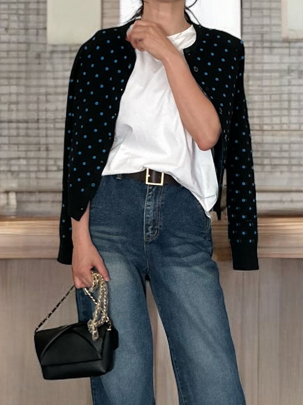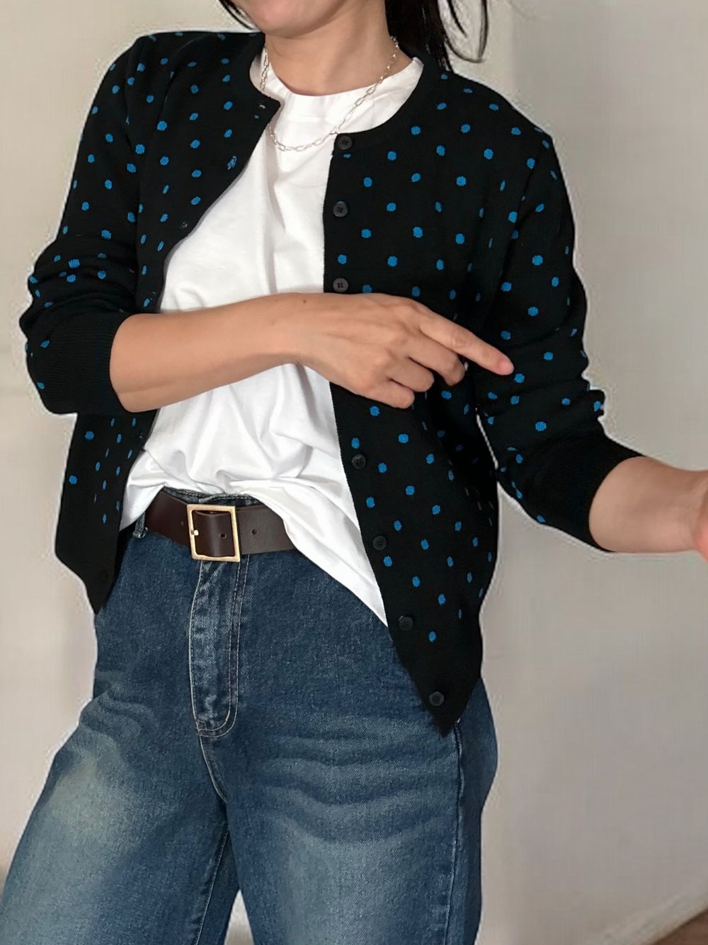 ベーシックな定番カラーに主張しすぎない小さめのドット柄を施したカシミアブレンドのクルーネックカーディガン。