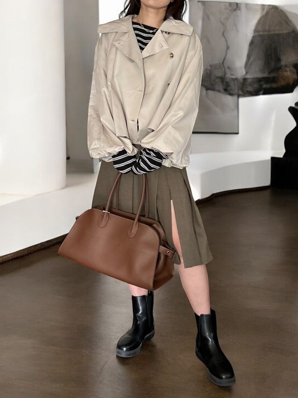 襟周りはゆとりを持たせたスタンドカラーでタートルニットを着用していても、顔周りがもたつくことなく窮屈さを感じさせないのもおすすめのポイント。