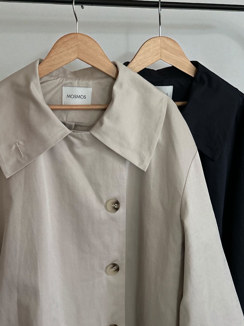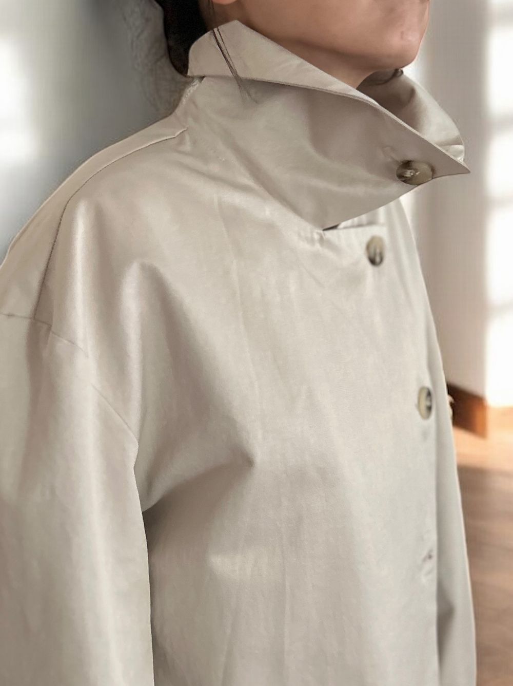 襟を寝かせてコンバーティブルカラーとして、またボタンを留めることで高めの立襟のストームカラーに変身、2WAYで着用いただけます。