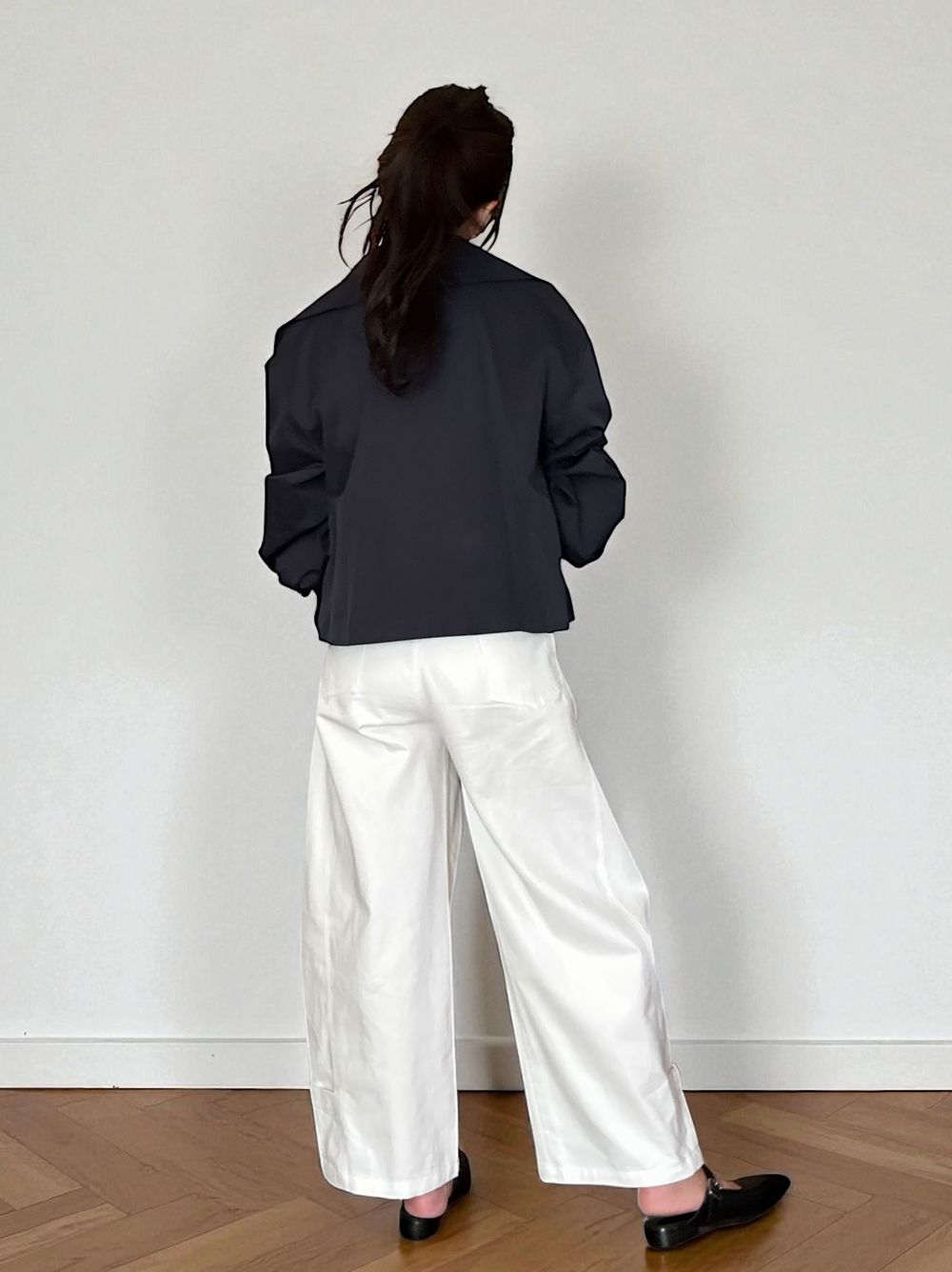 袖はタックを入れる事で自然な丸みがでて、かっこいいシルエットのなかにも甘さがプラスされたデザイン。
