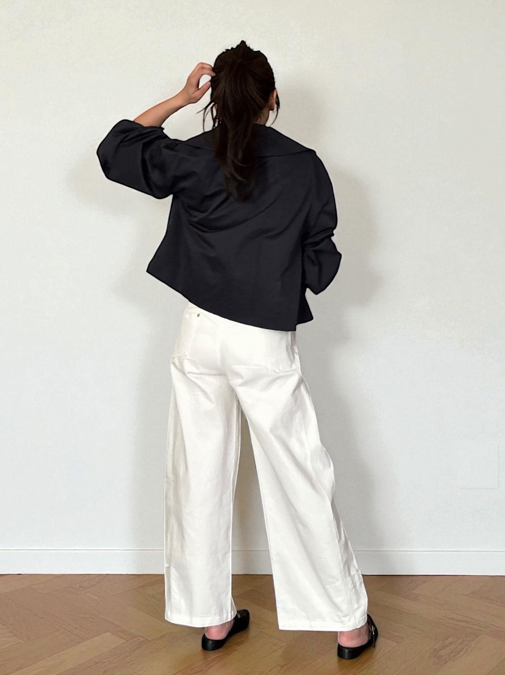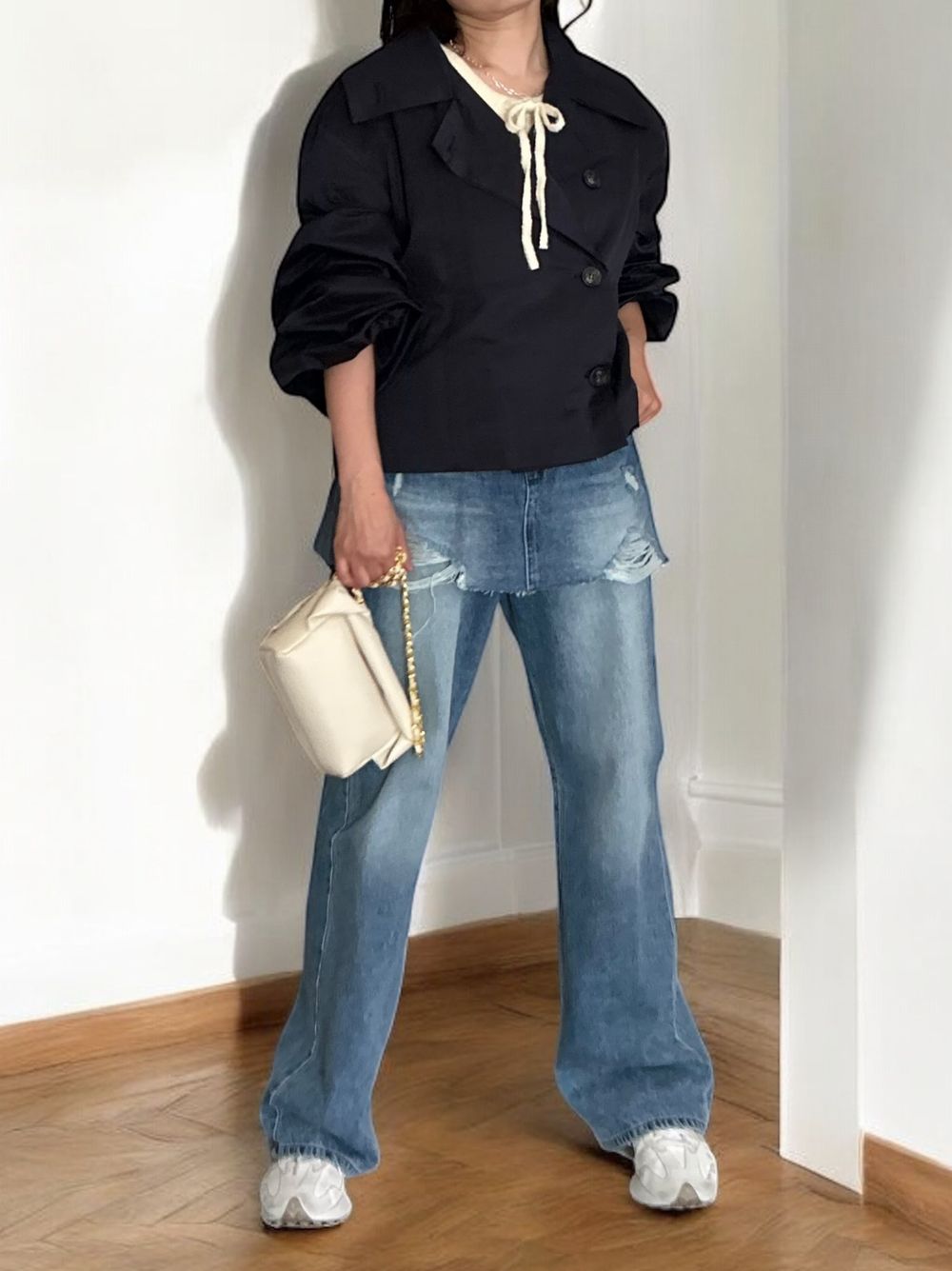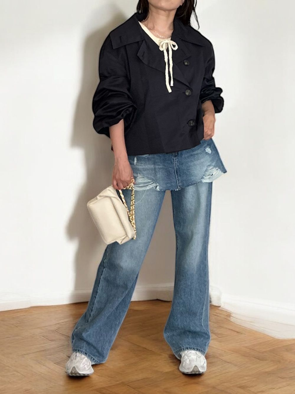 フロントボタンを閉めて襟を立たせることで、かわいさの中にもカッコよさも兼ね備えたコーディネートが完成します。