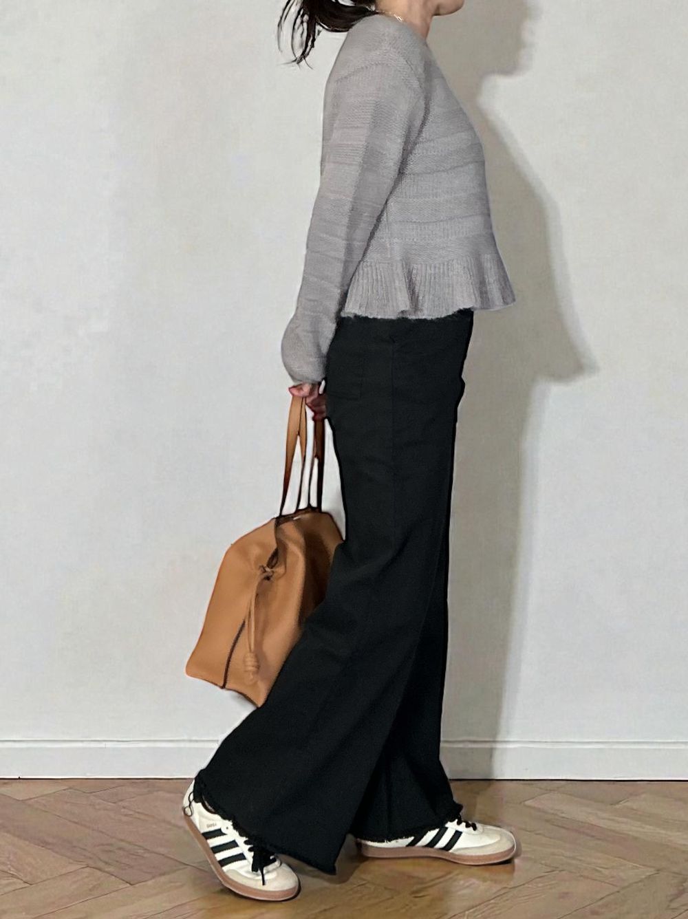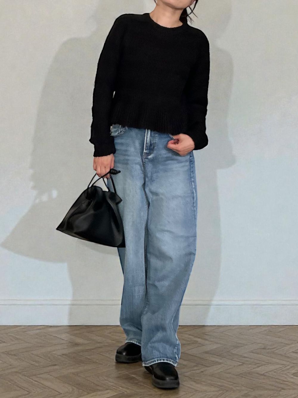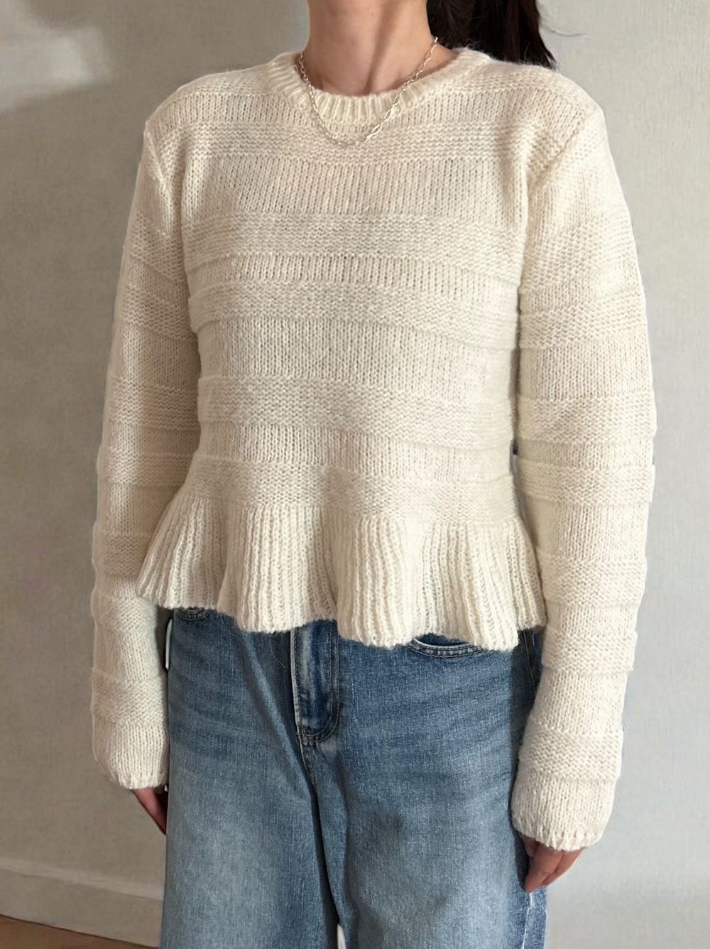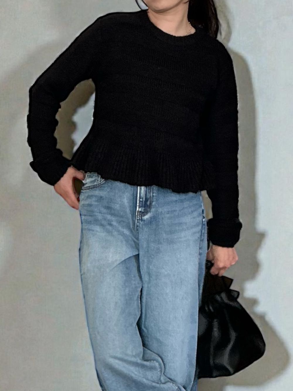 ふんわりとミドルゲージで編みこんだリブデザインに、甘くなり過ぎないゆるやかなペプラムが大人コーデを引き立てます。