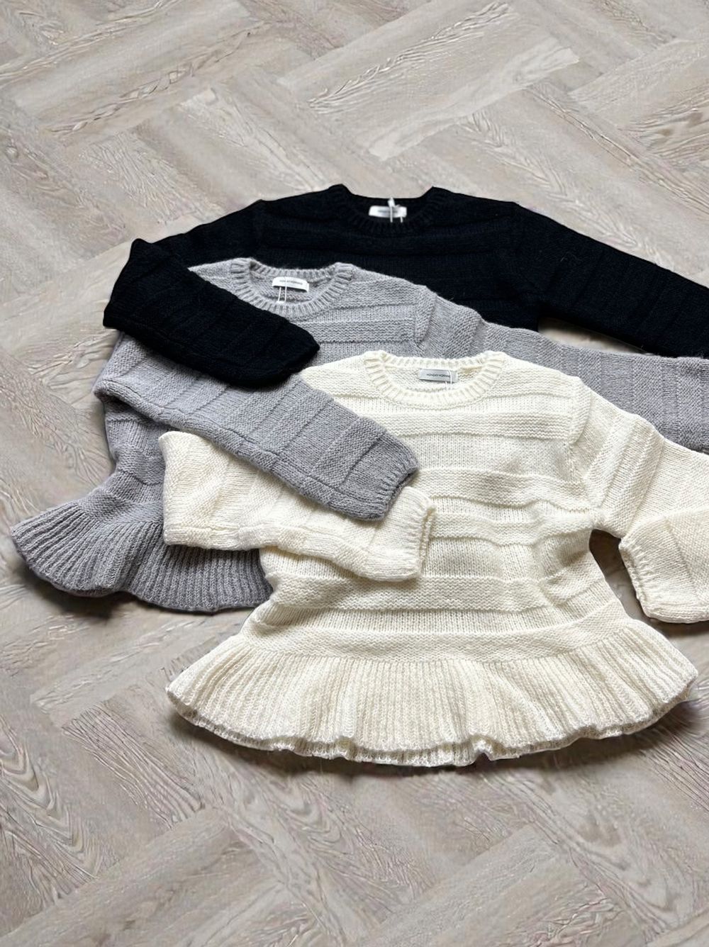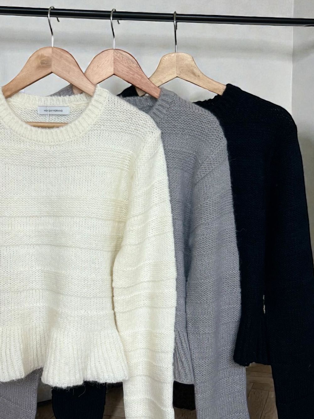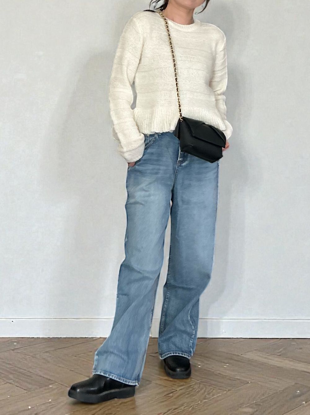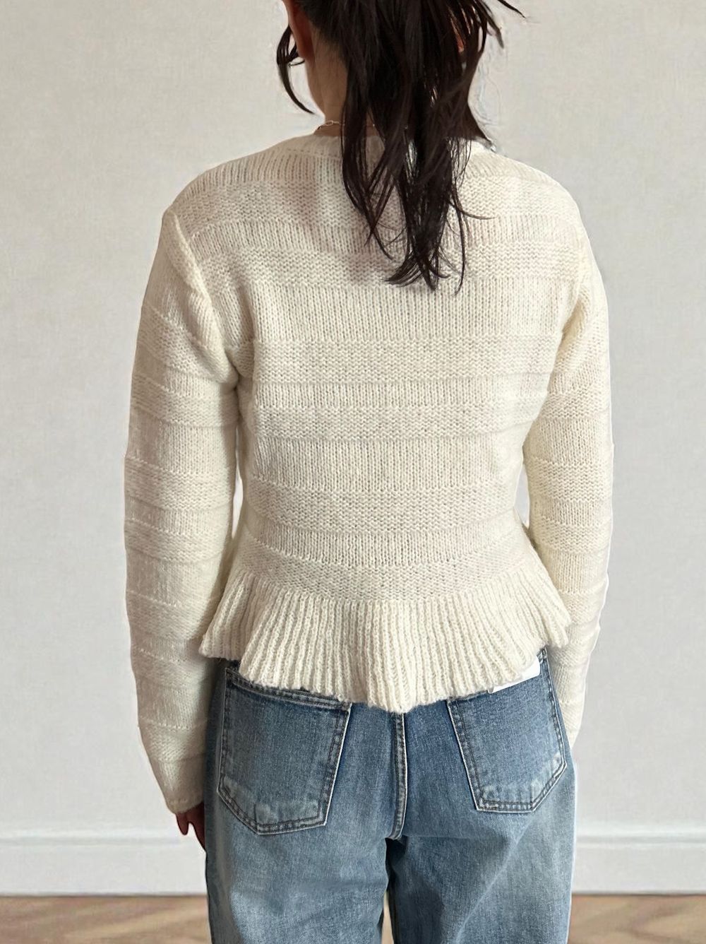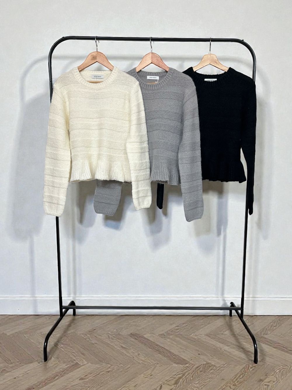 ふんわりとミドルゲージで編みこんだリブデザインに、甘くなり過ぎないゆるやかなペプラムが大人コーデを引き立てます。