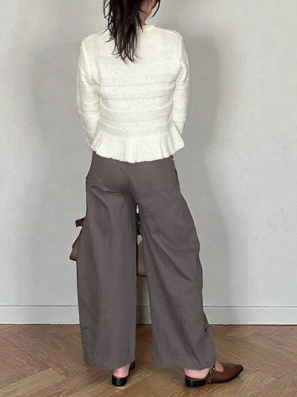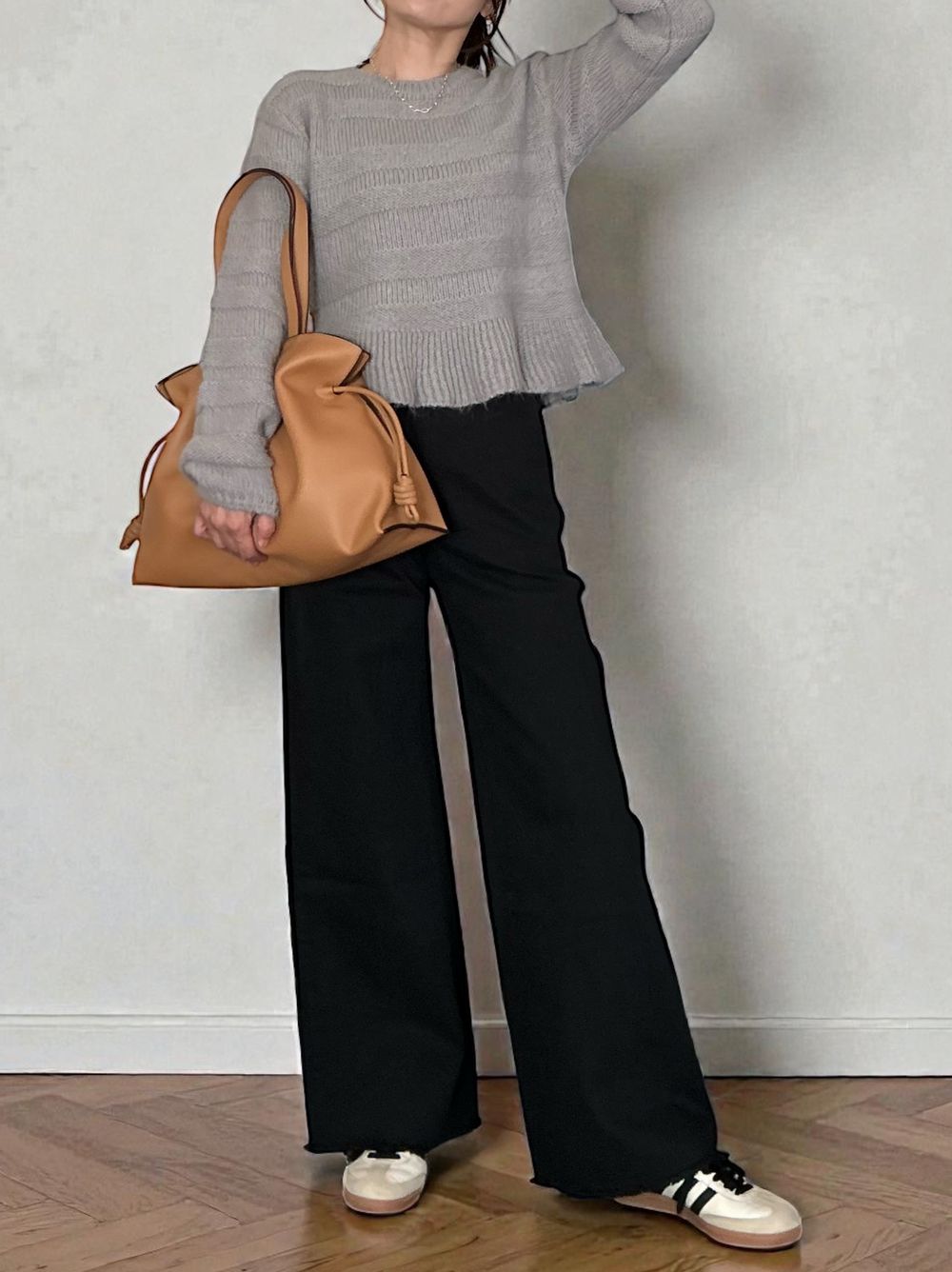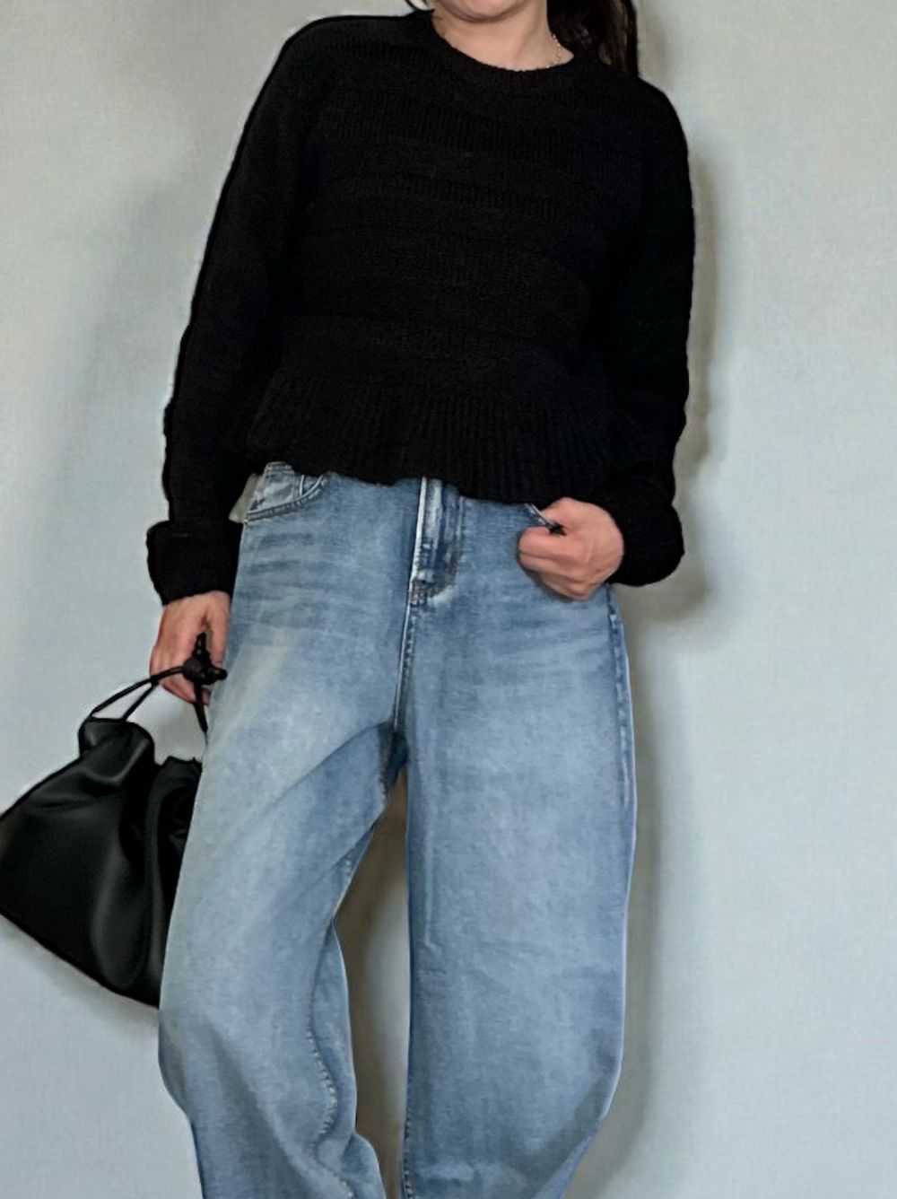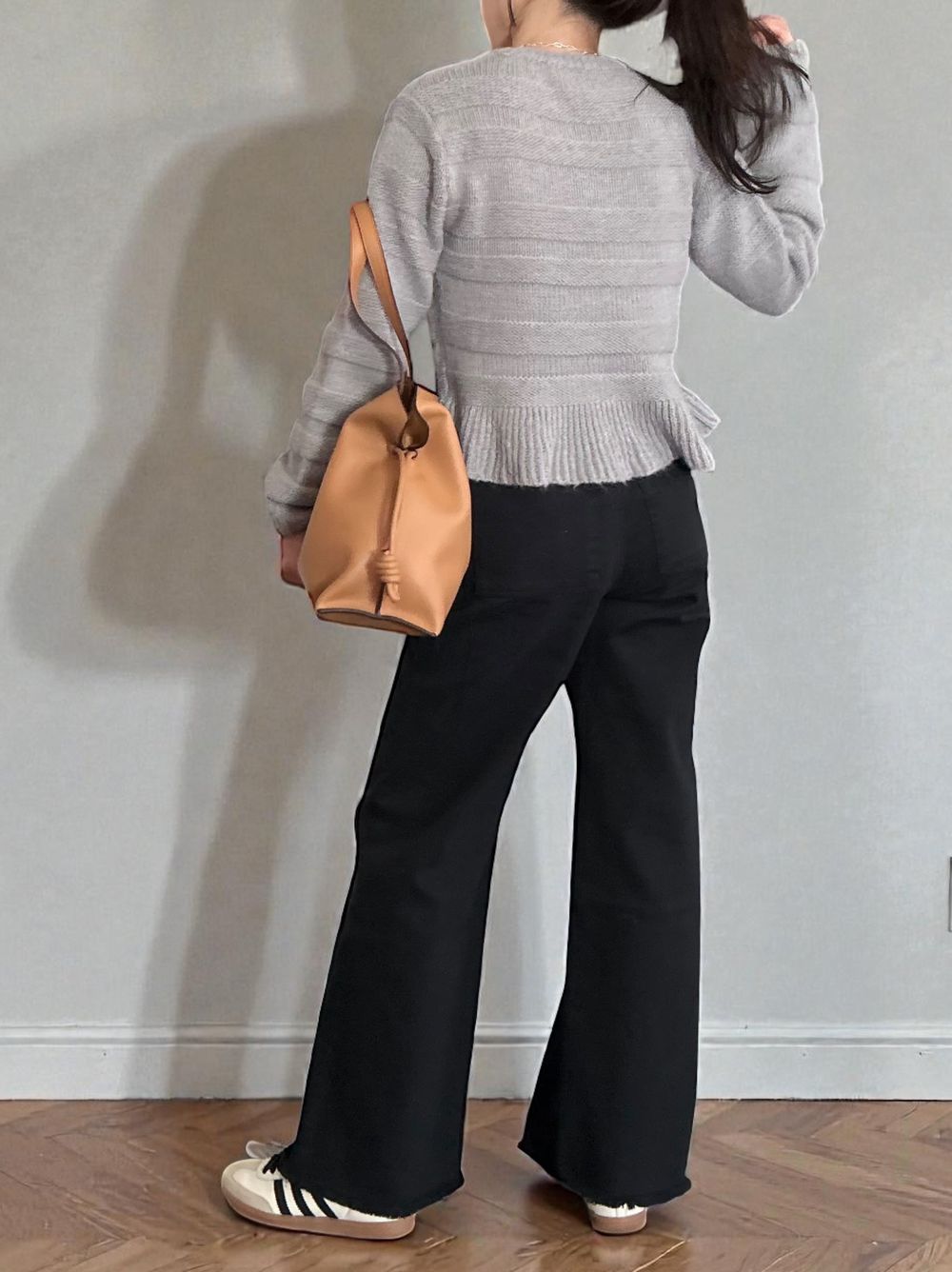 ふんわりとミドルゲージで編みこんだリブデザインに、甘くなり過ぎないゆるやかなペプラムが大人コーデを引き立てます。