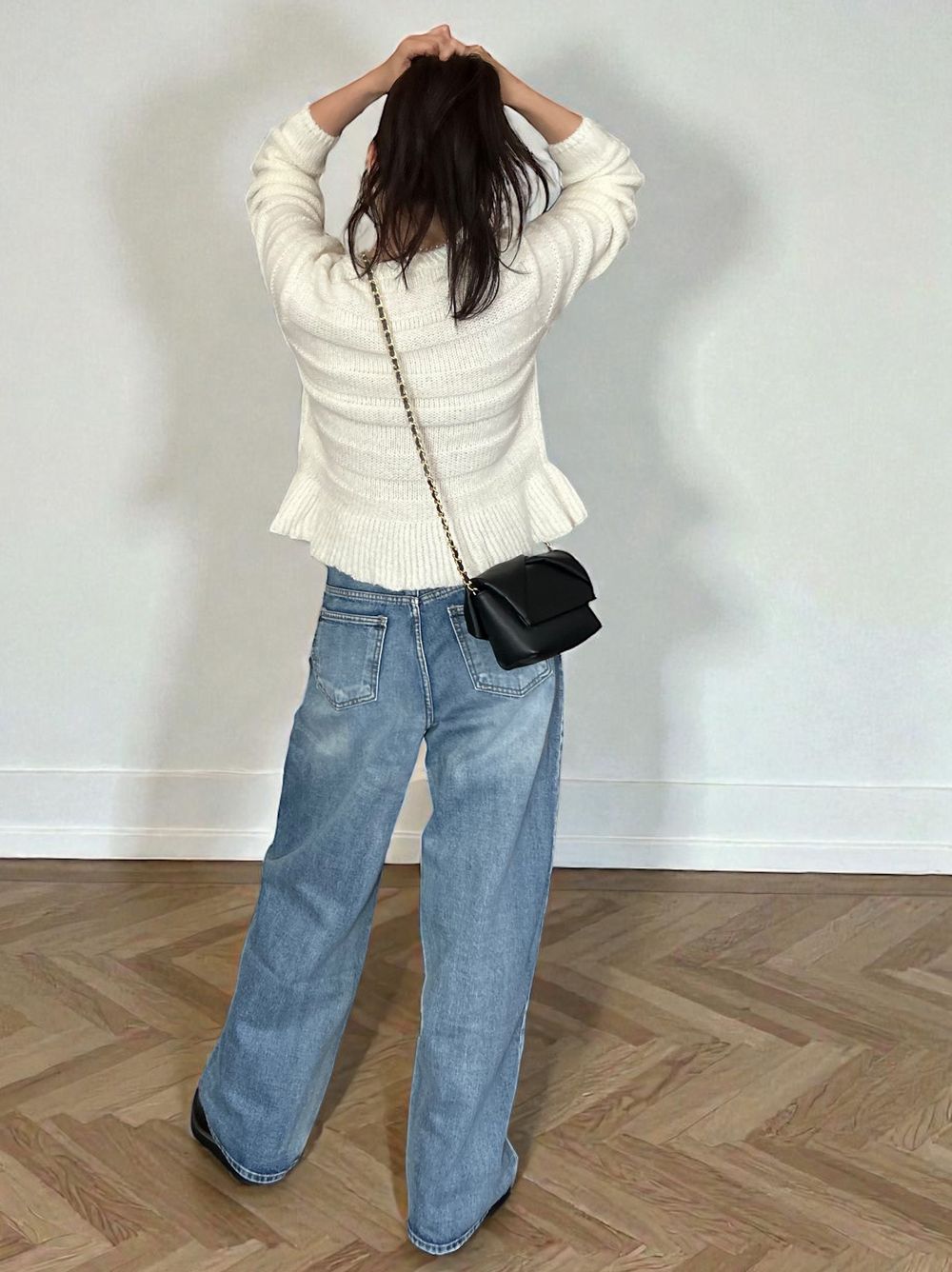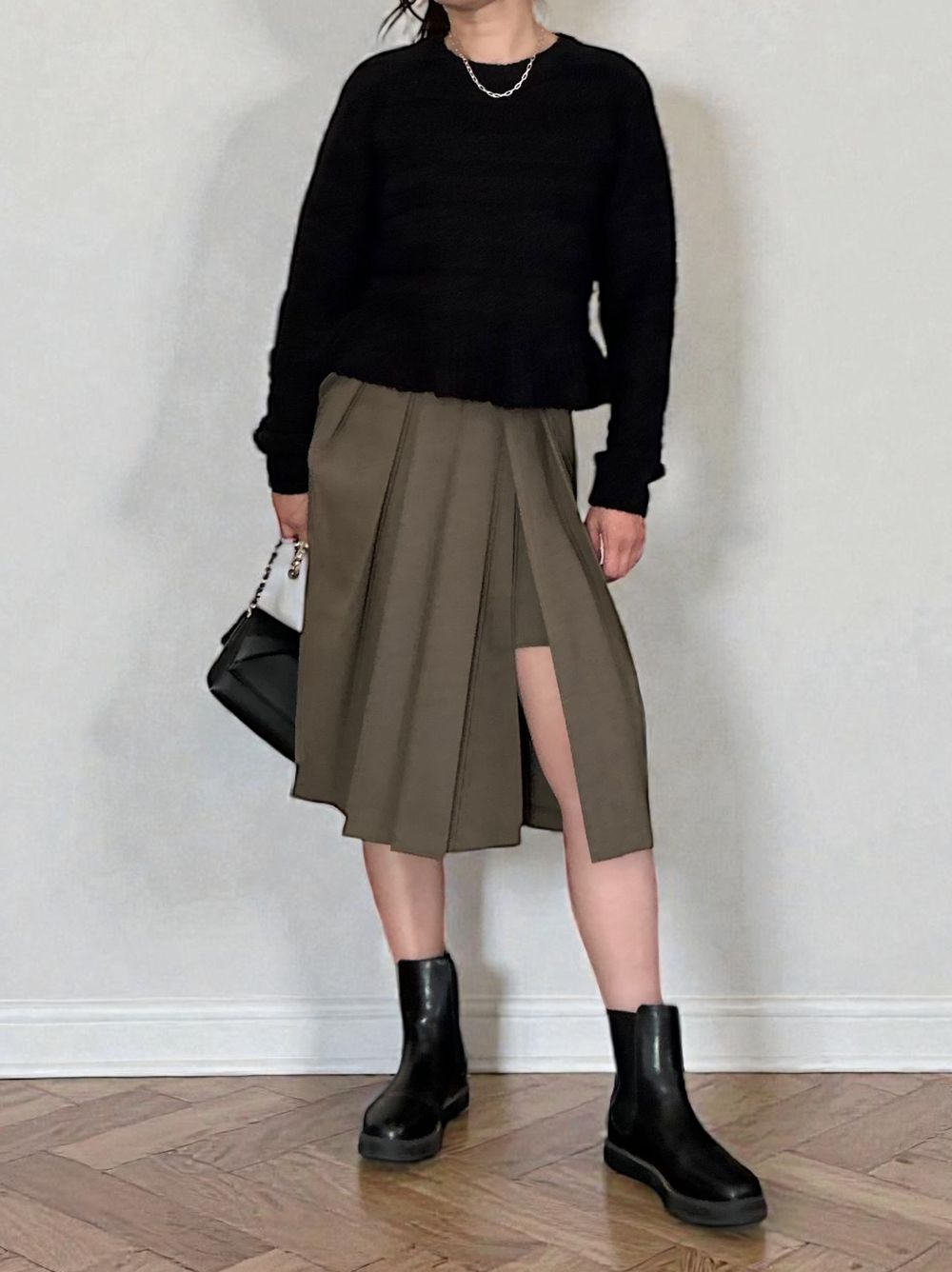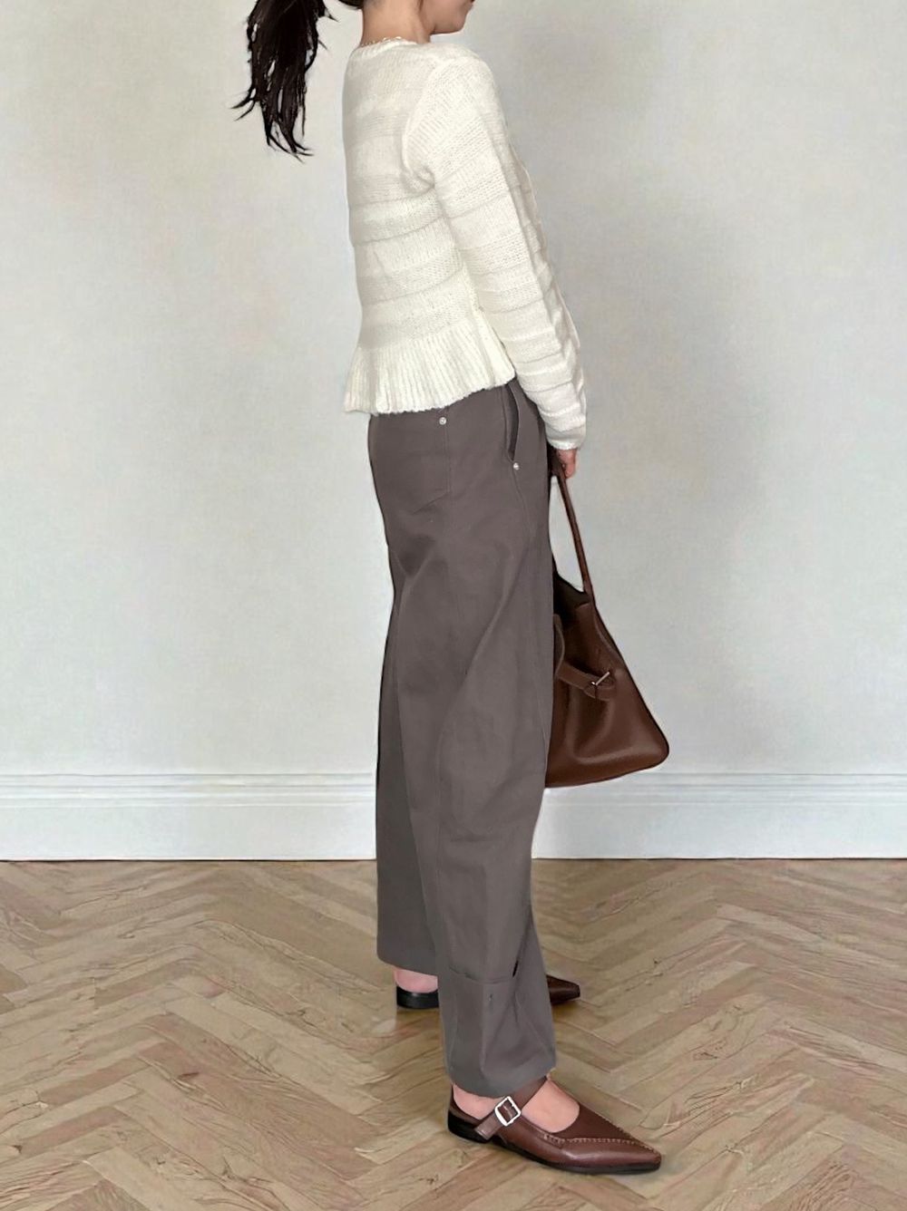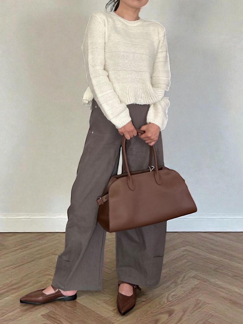 ふんわりとミドルゲージで編みこんだリブデザインに、甘くなり過ぎないゆるやかなペプラムが大人コーデを引き立てます。