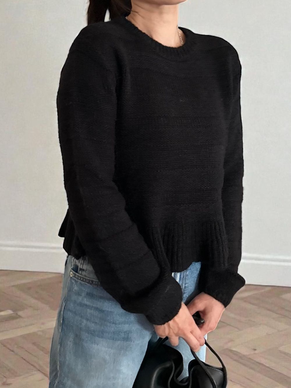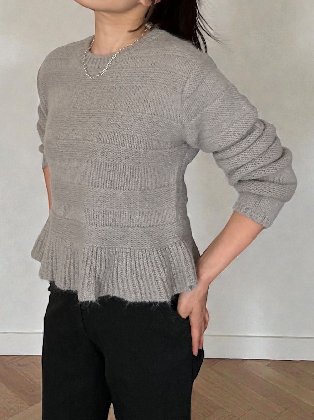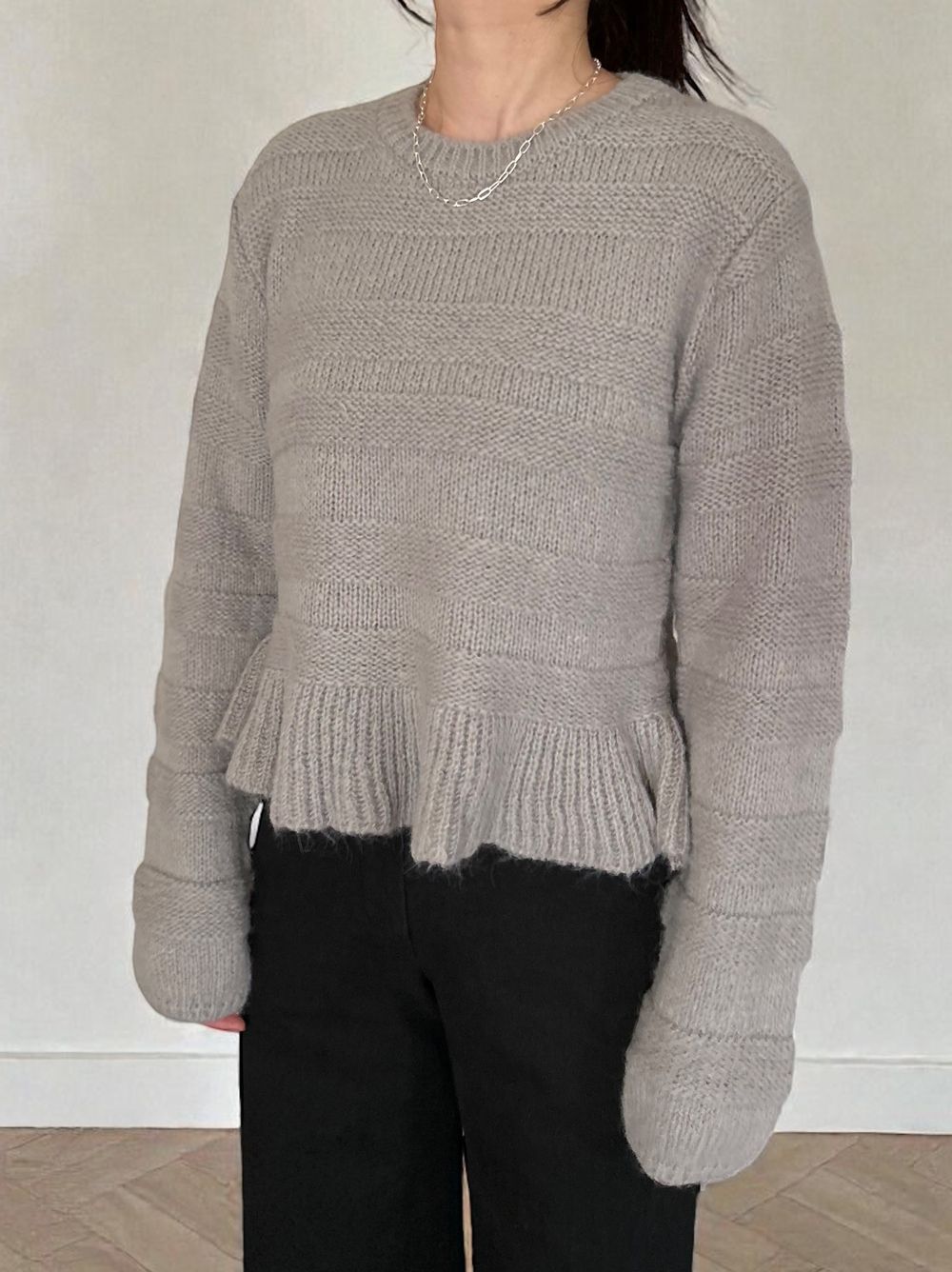 ふんわり広がる裾のペプラムデザインと、ぽわんとして丸みのある袖でレディライクを盛り込んだクルーネックニット。