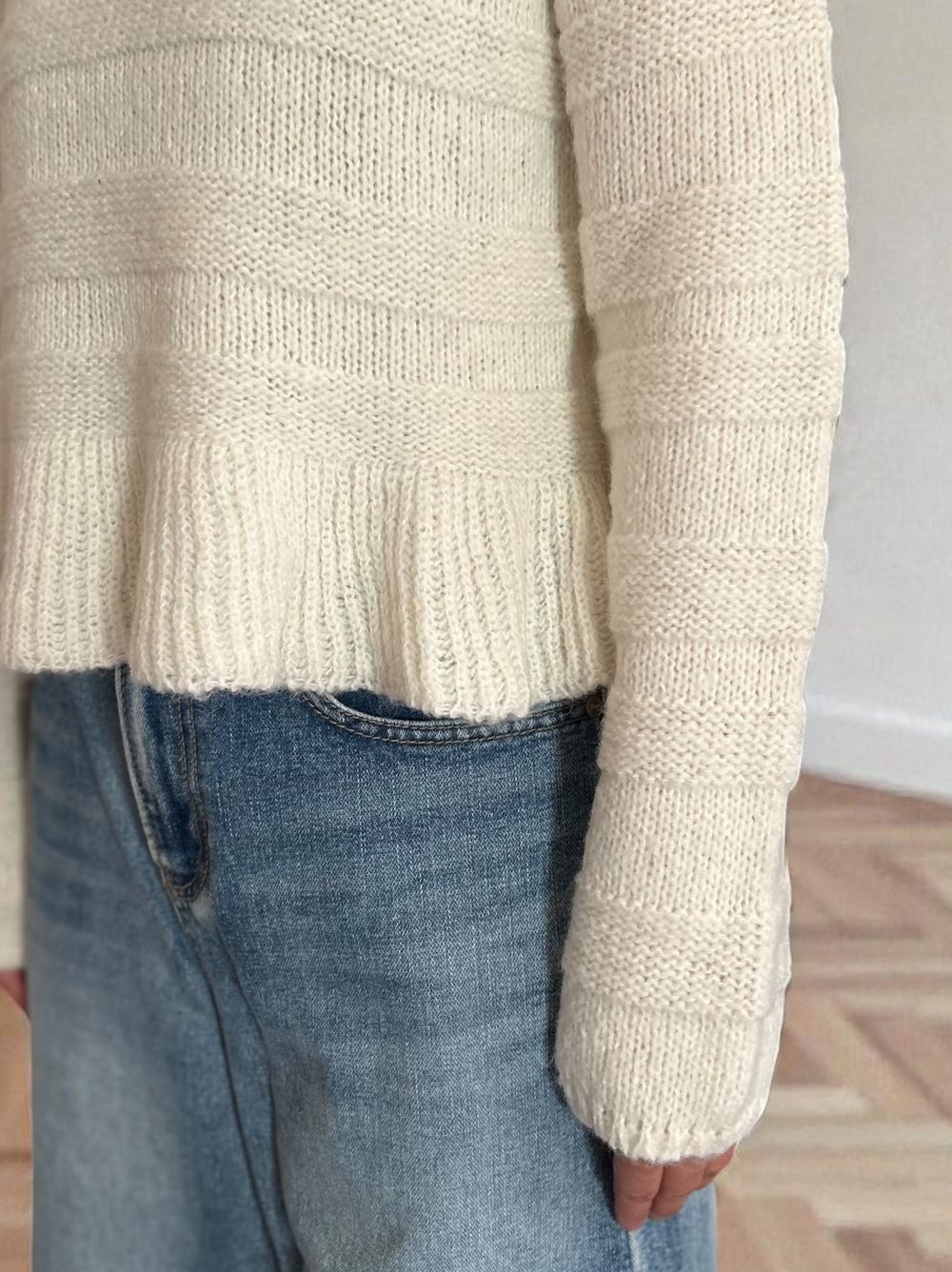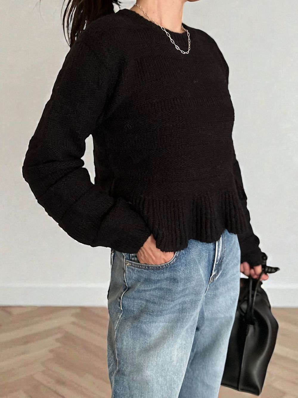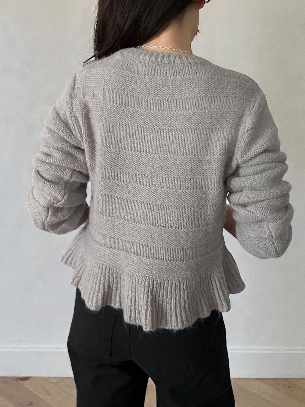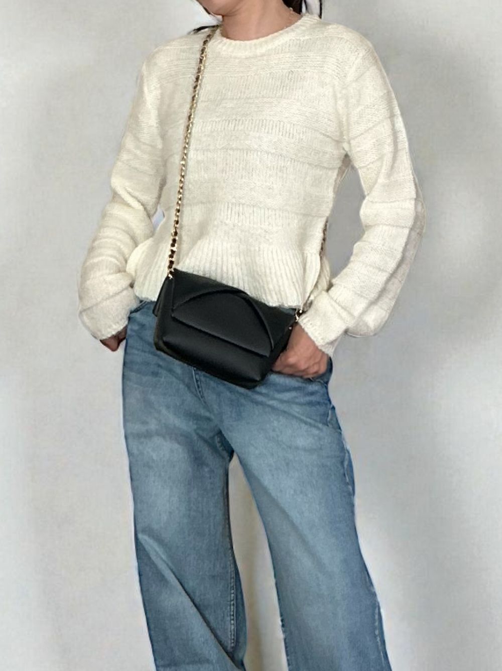 ふんわり広がる裾のペプラムデザインと、ぽわんとして丸みのある袖でレディライクを盛り込んだクルーネックニット。