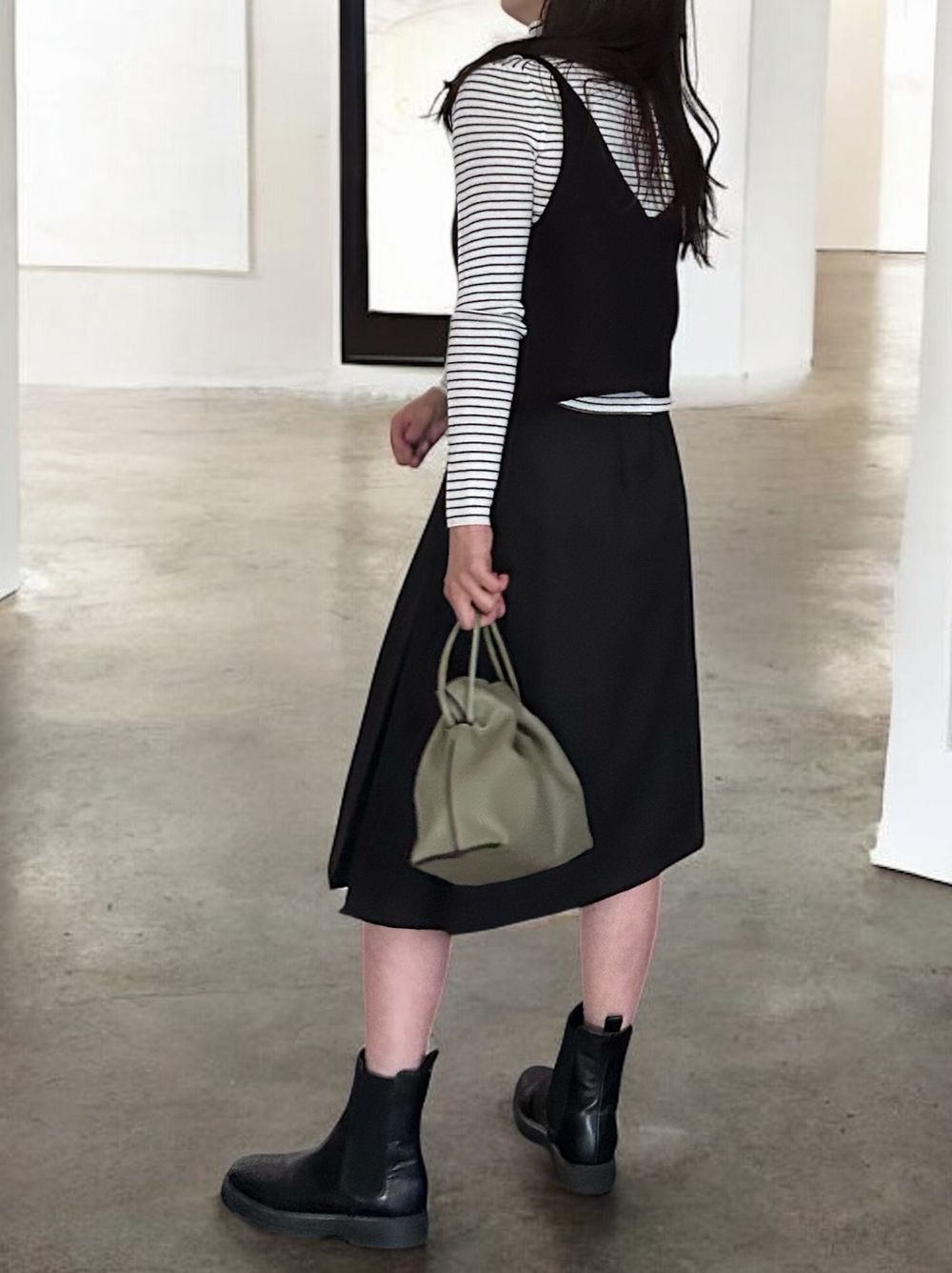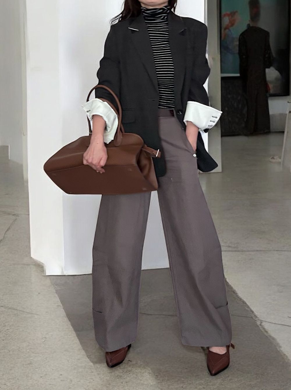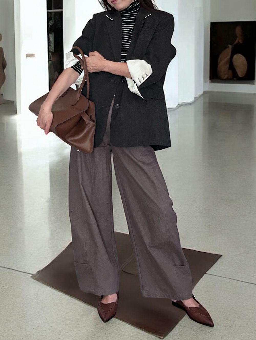 強調しすぎないチョークストライプがカジュアルダウンさせ、しっくりと大人コーデを引き立たせます。