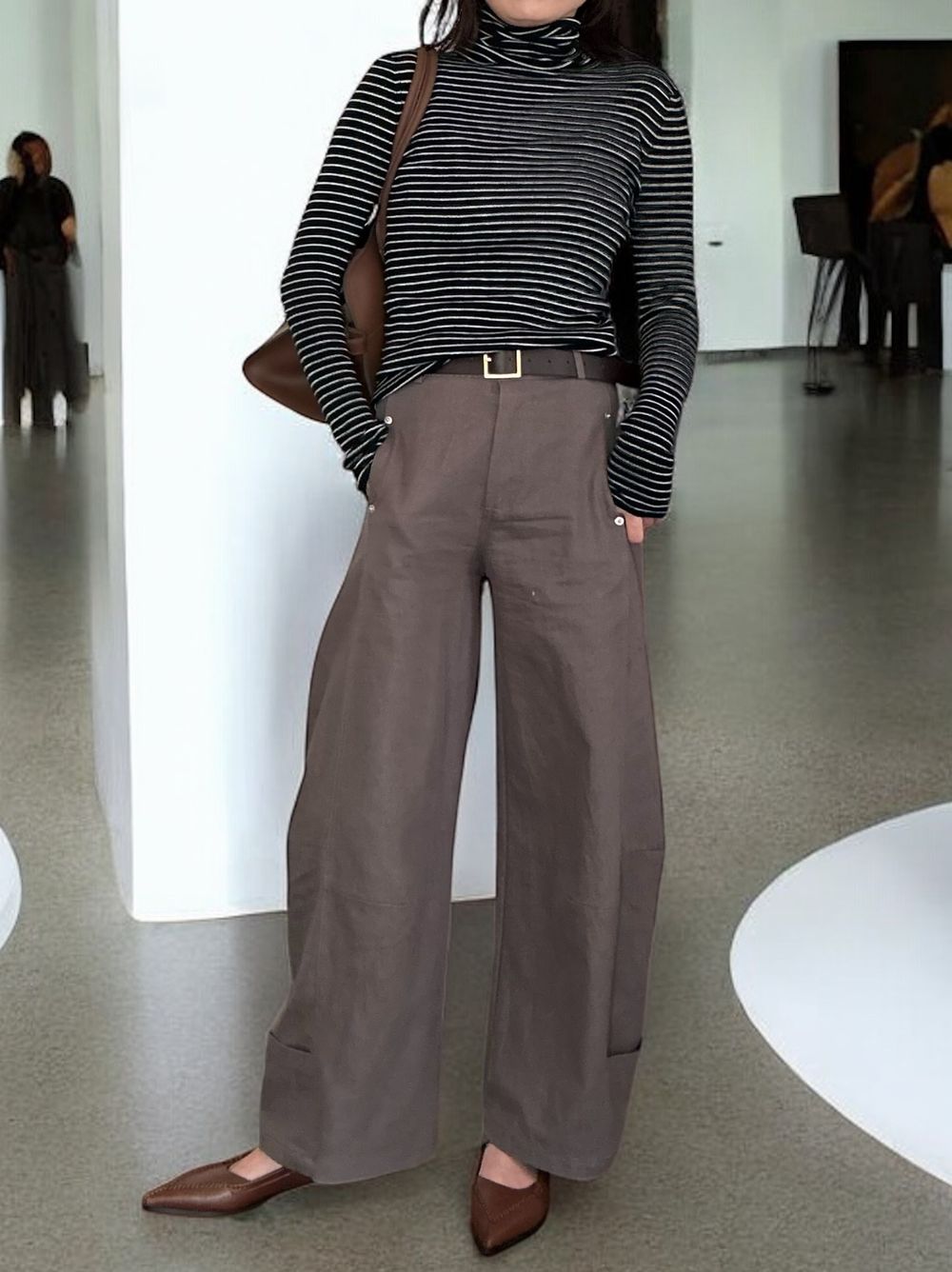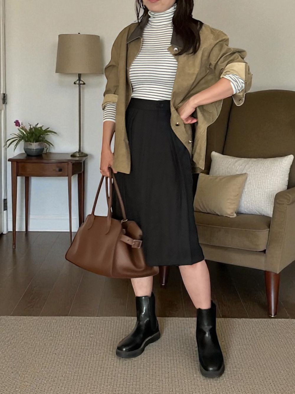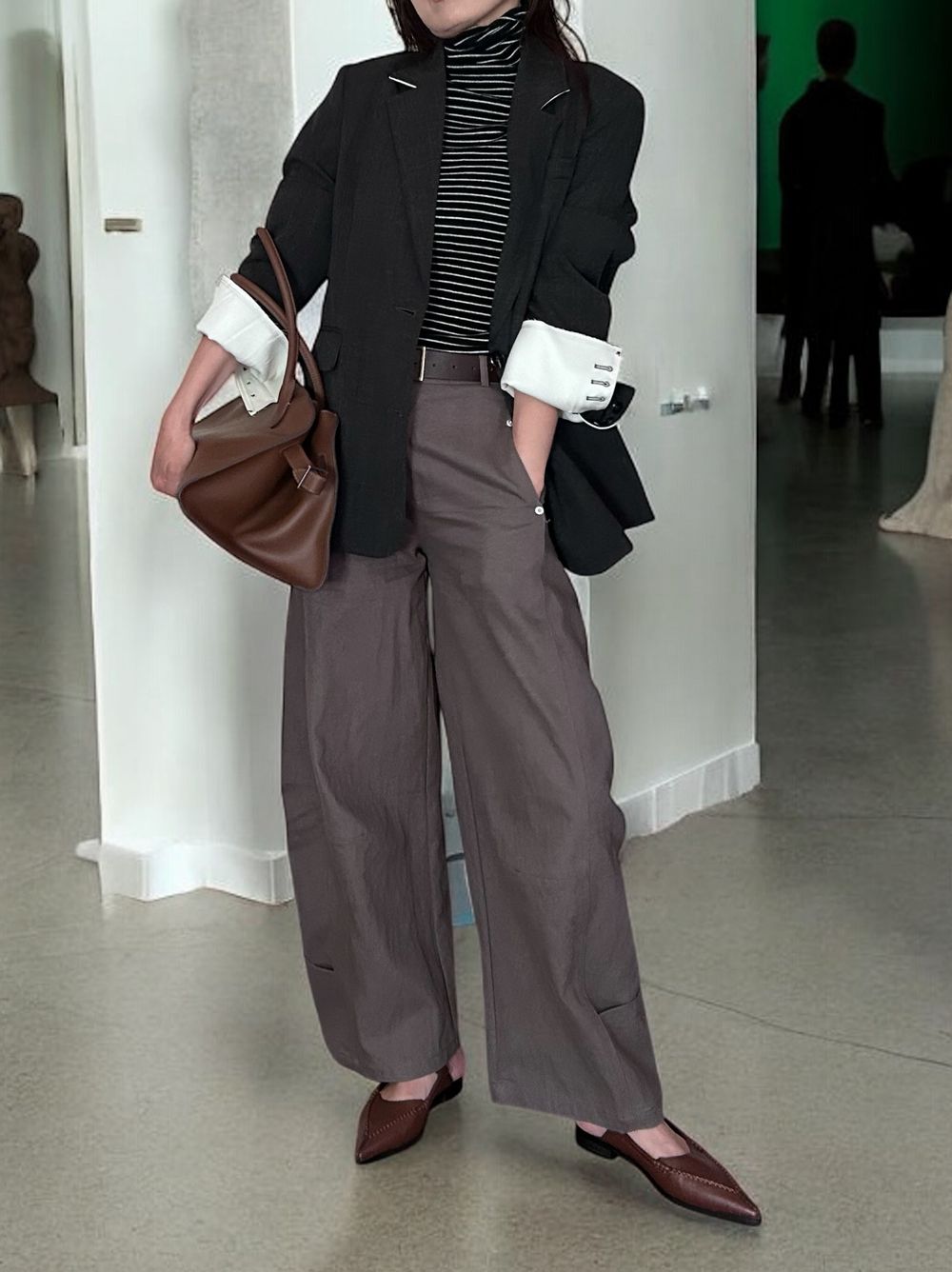 強調しすぎないチョークストライプがカジュアルダウンさせ、しっくりと大人コーデを引き立たせます。