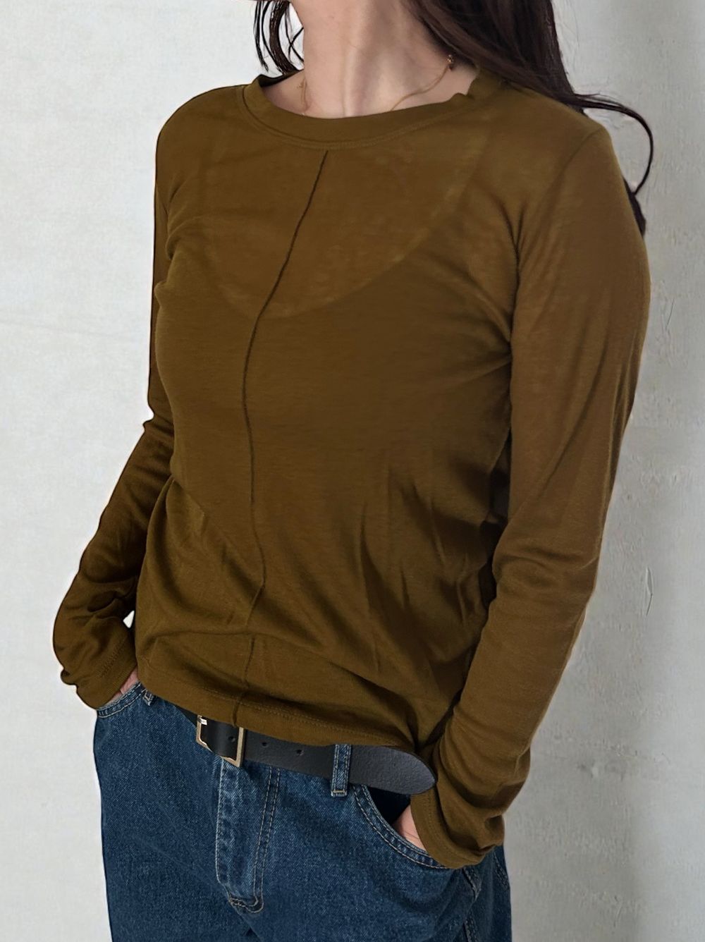 ウール混素材ならではの薄手なのにほんのり暖かい着心地で、真冬のインナーまで長く活躍してくれるちょうどいい存在感のトップス。