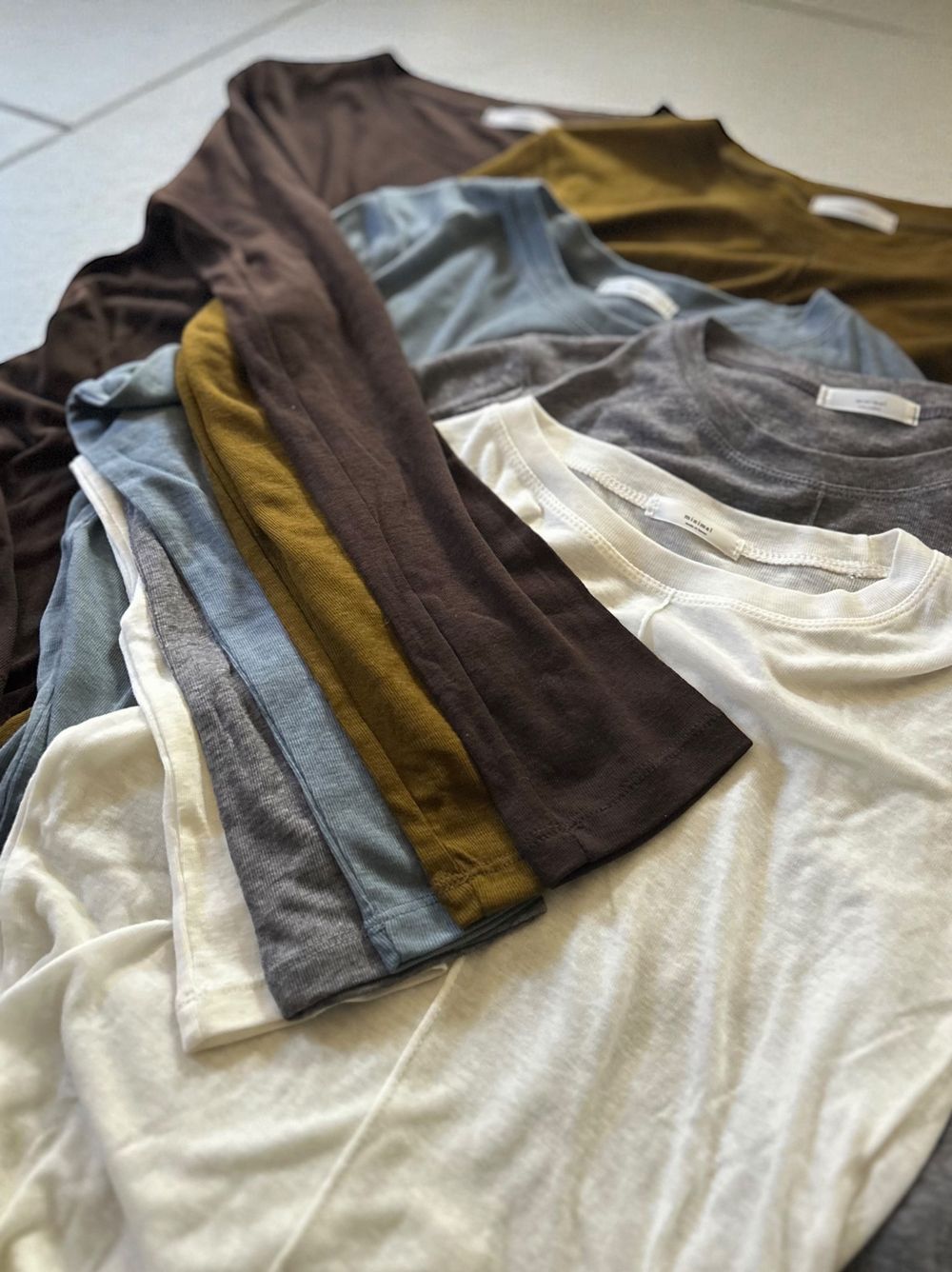 ベーシックから差し色まで揃え、重ね着したときの配色を楽しめるラインナップです。