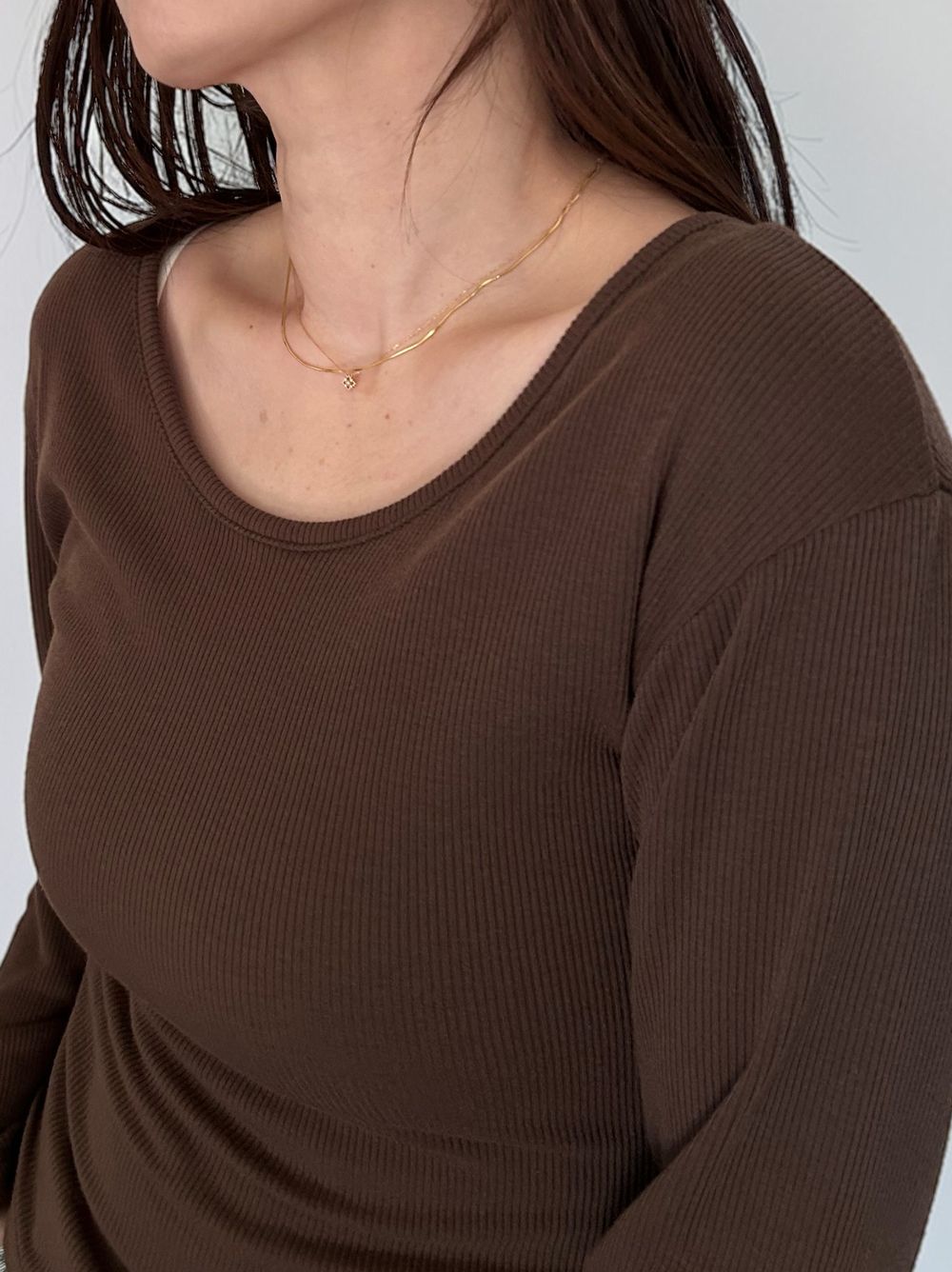 詰まりすぎず、開きすぎない絶妙なネックラインは、一枚で着ても、インナーとしてもバランスよく決まる設計に。