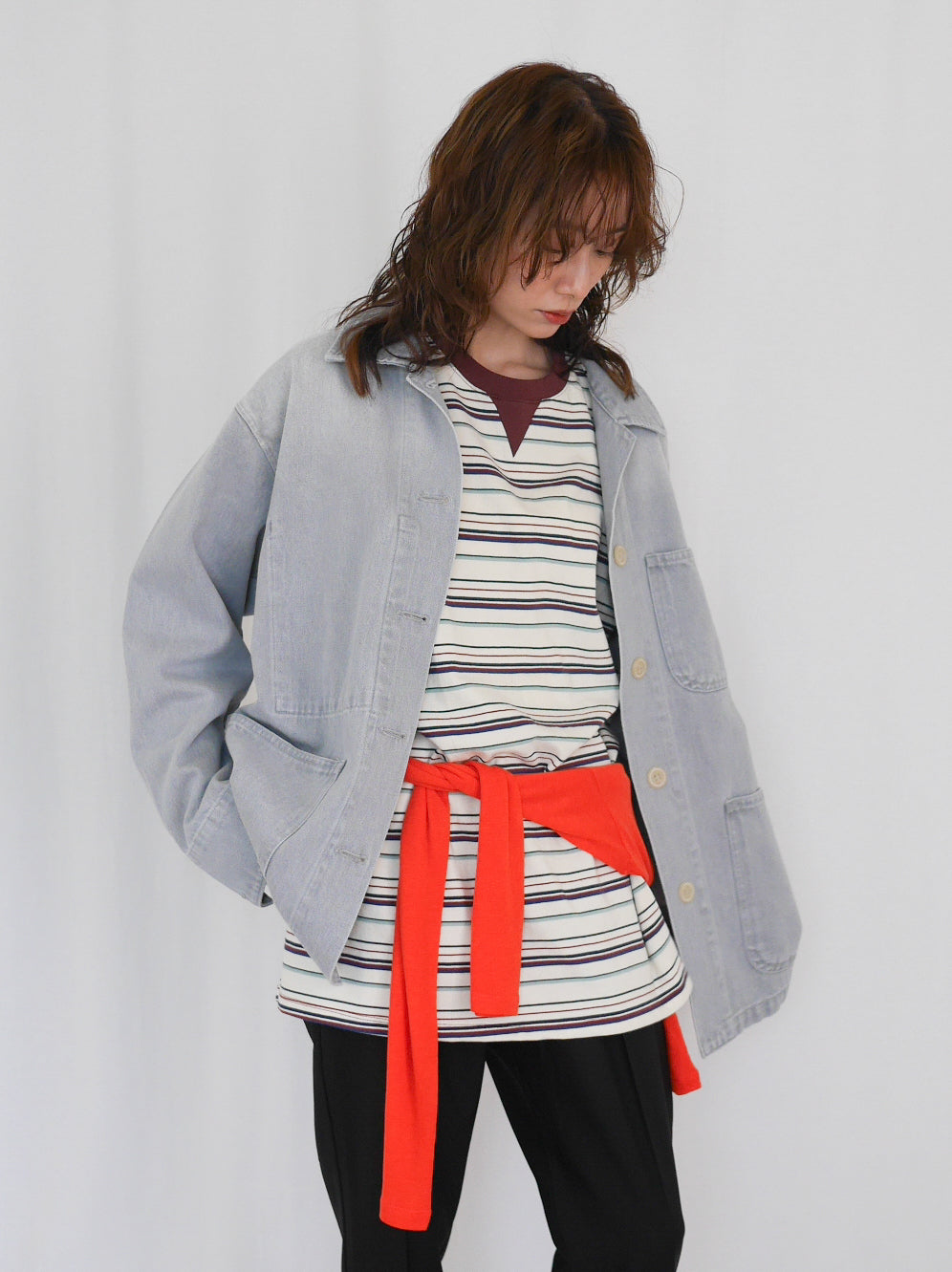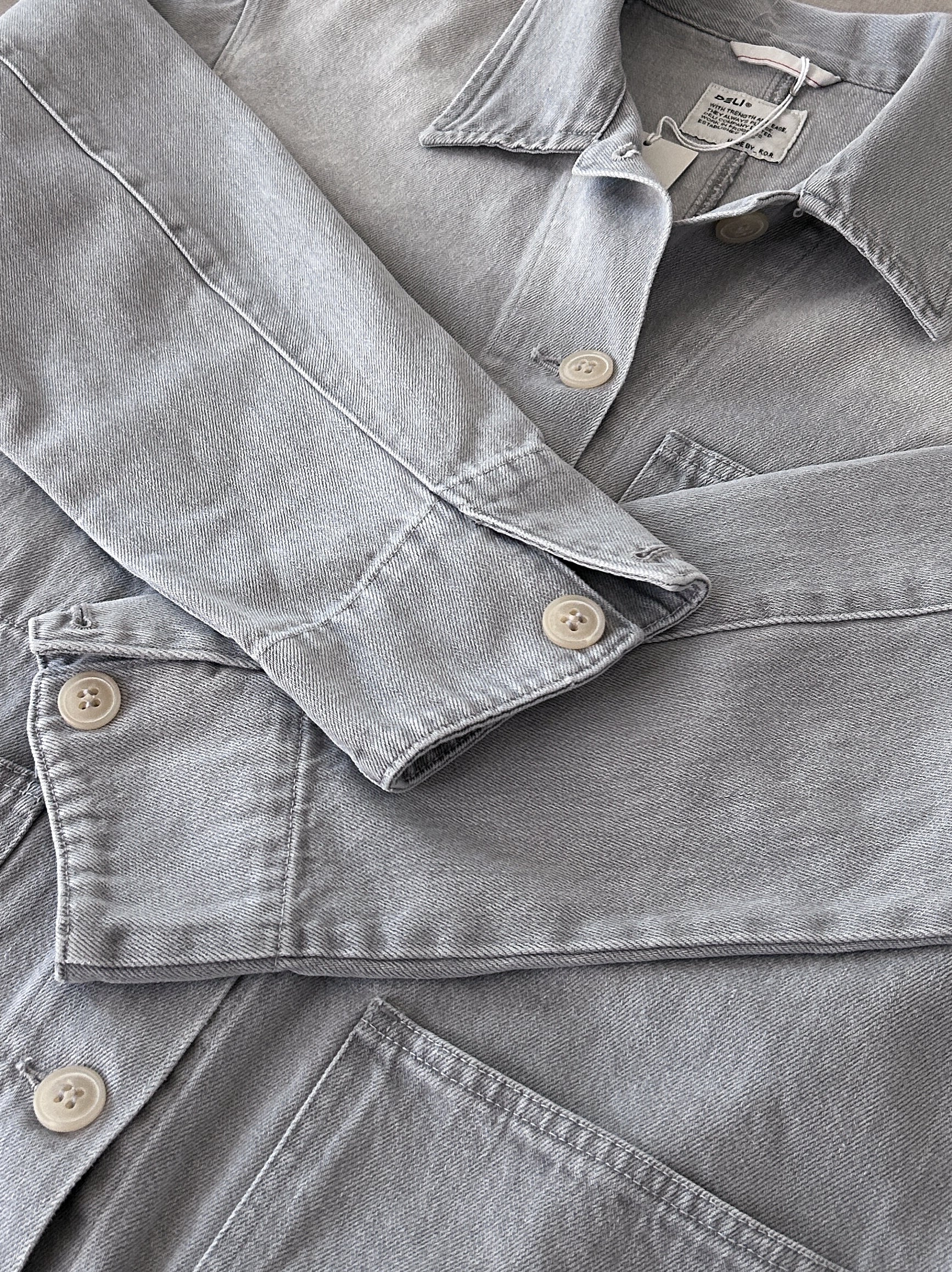 グレーのウォッシュ加工を施したデニム生地が、どこか洗練された印象を与えるカバーオールジャケット。